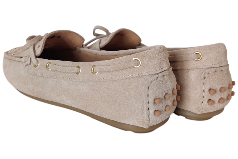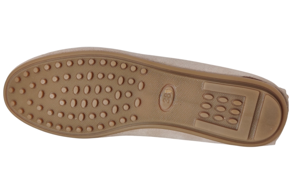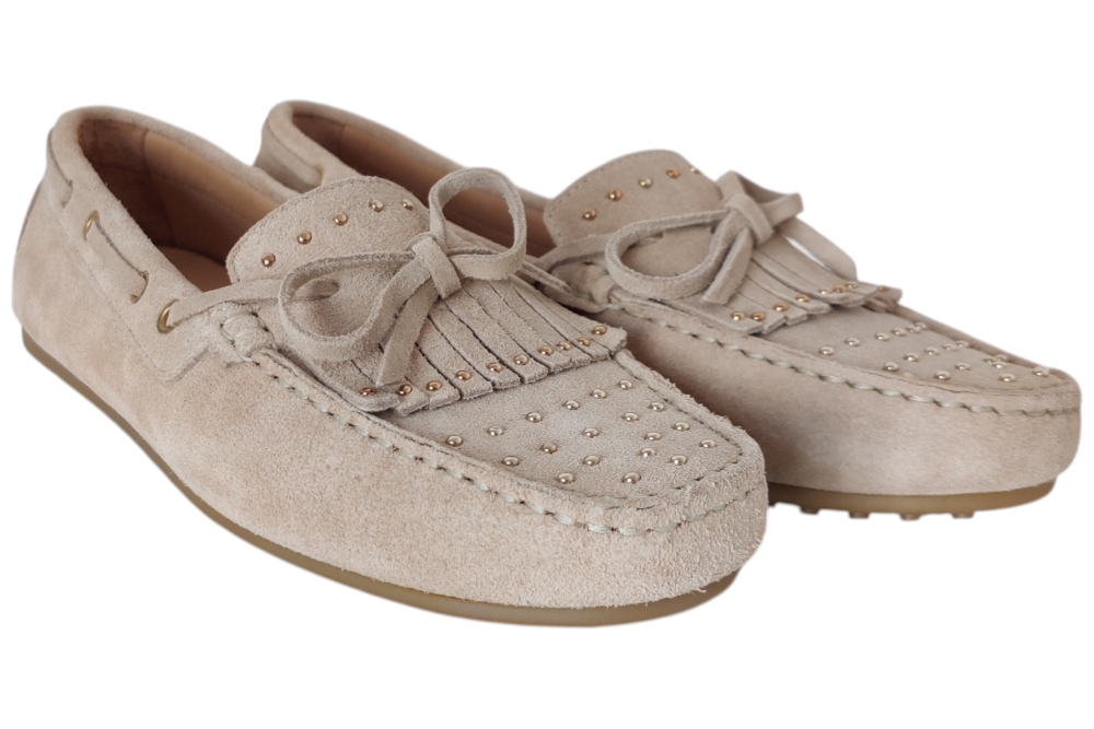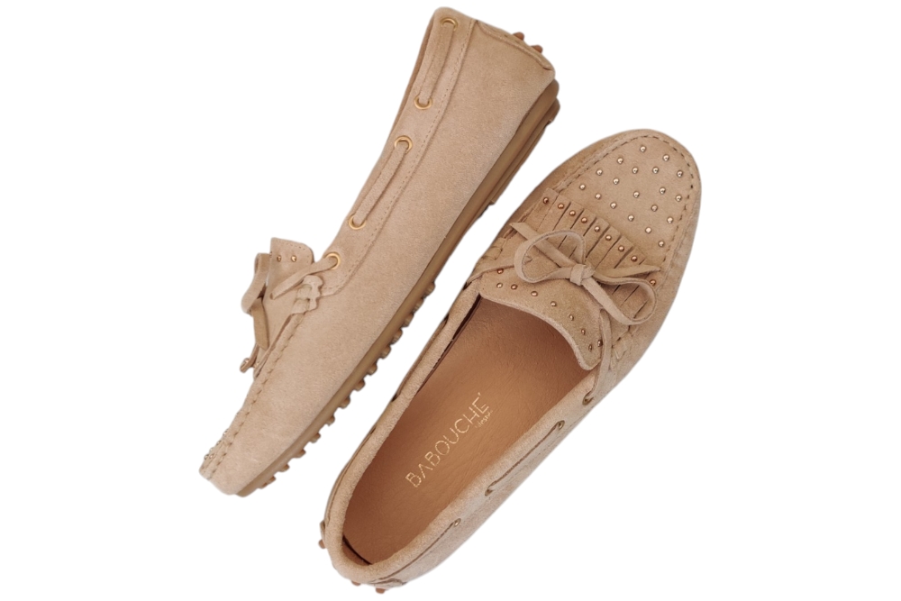 Moccasins van Babouche. Hippe moccasins met stuts op de voet.Deze maccasins heeft losse binnenzolen.Kleur beige.Matriaal suede.Voering leer. Zool rubber ca 1 cm.