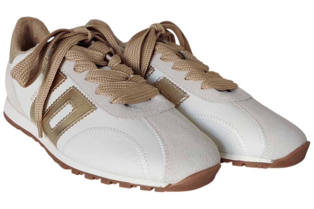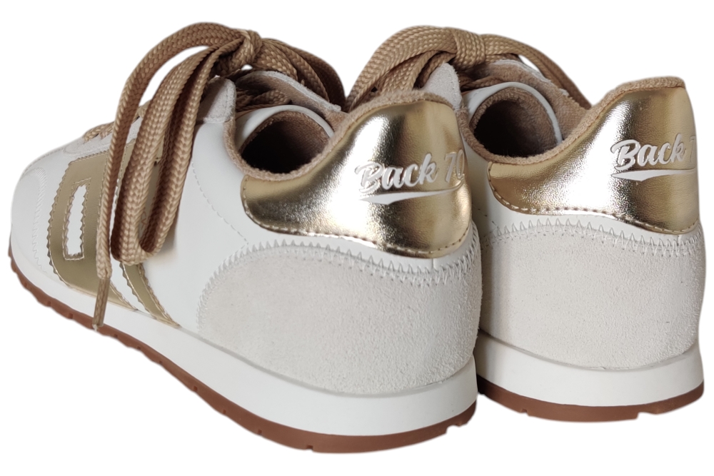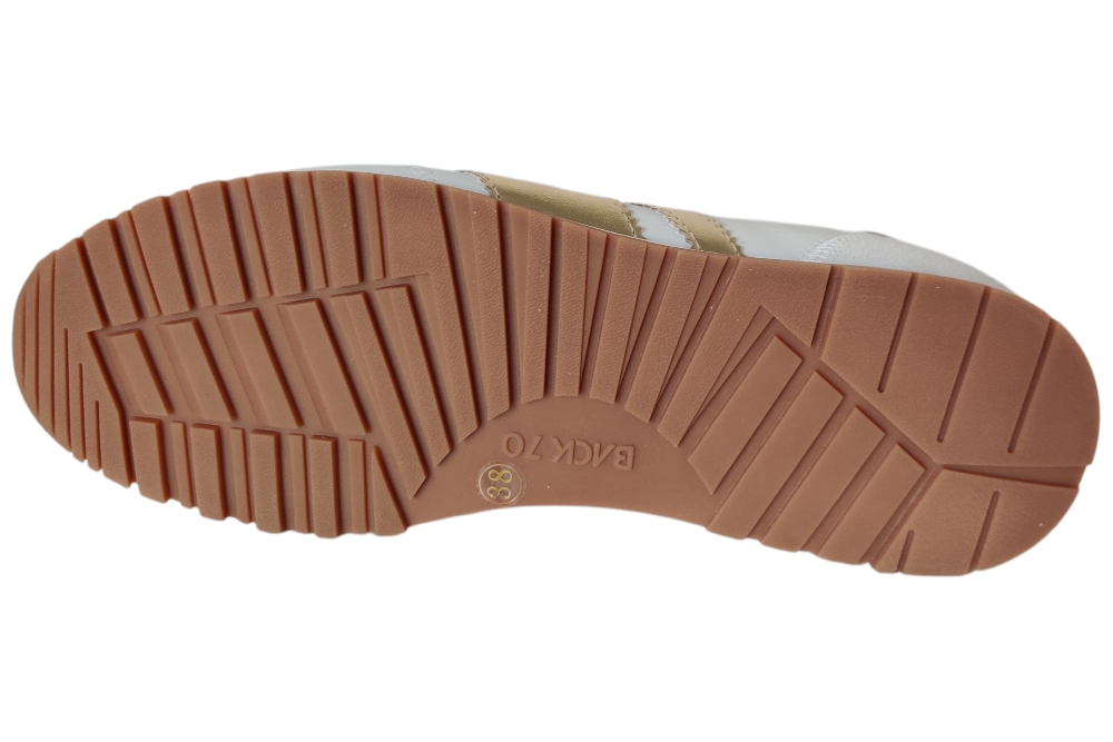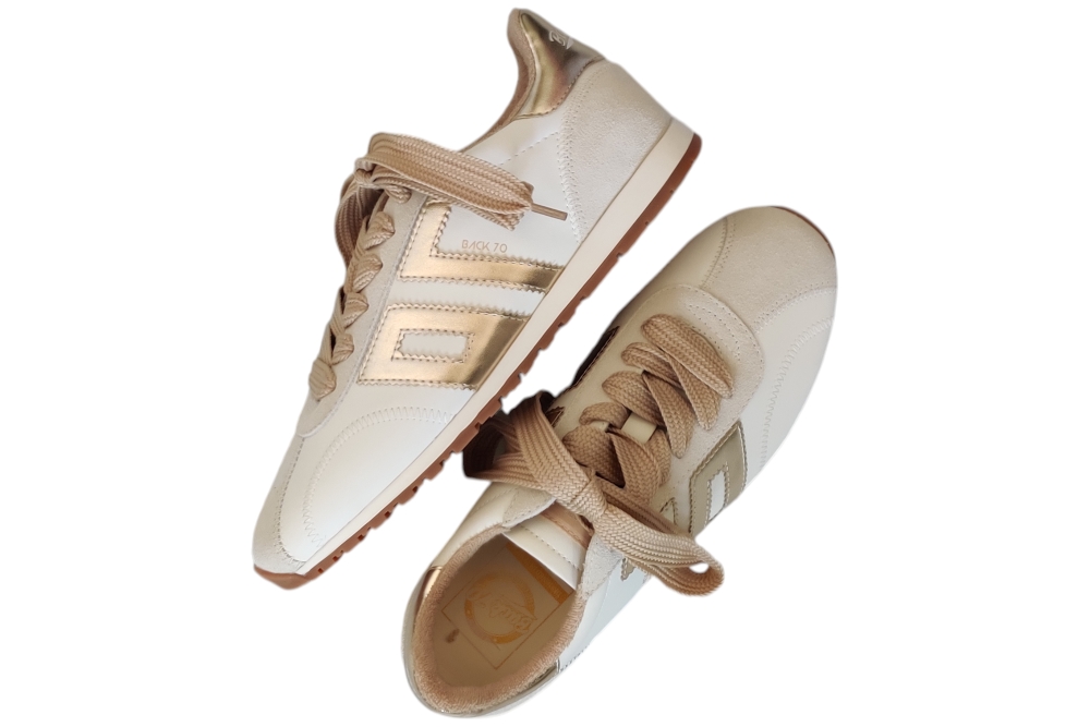 Dames sneaker van BACK 70 . Sportieve sneaker in een combinatie van verschillende materialen en kleuren. Deze sneaker heeft een los voetbed. Materiaal: leer suede combi. Voering: textiel. Kleur: wit goud . Zool: rubber. Hakhoogte: ca 2 cm.