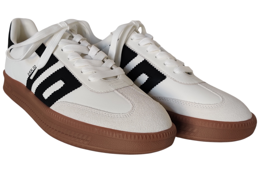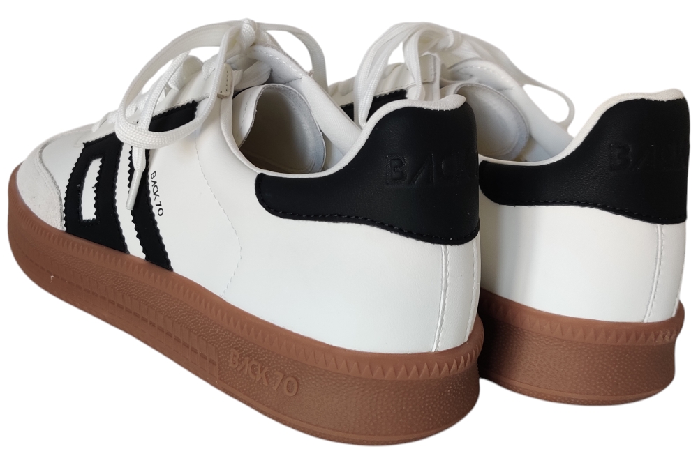Heren sneaker van Back 70. Sneaker in het wit zwart combi. Deze sneaker heeft een uitneembaar voetbed. Materiaal: leer . Voering: stof. Kleur: wit zwart combi. Zool: rubber. Hakhoogte: ca 3 cm.