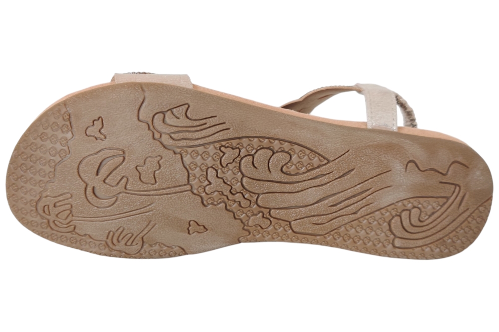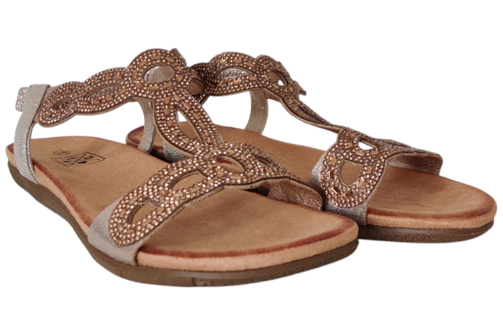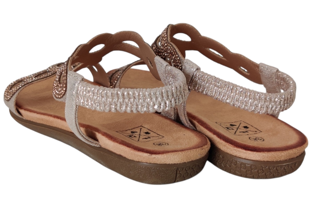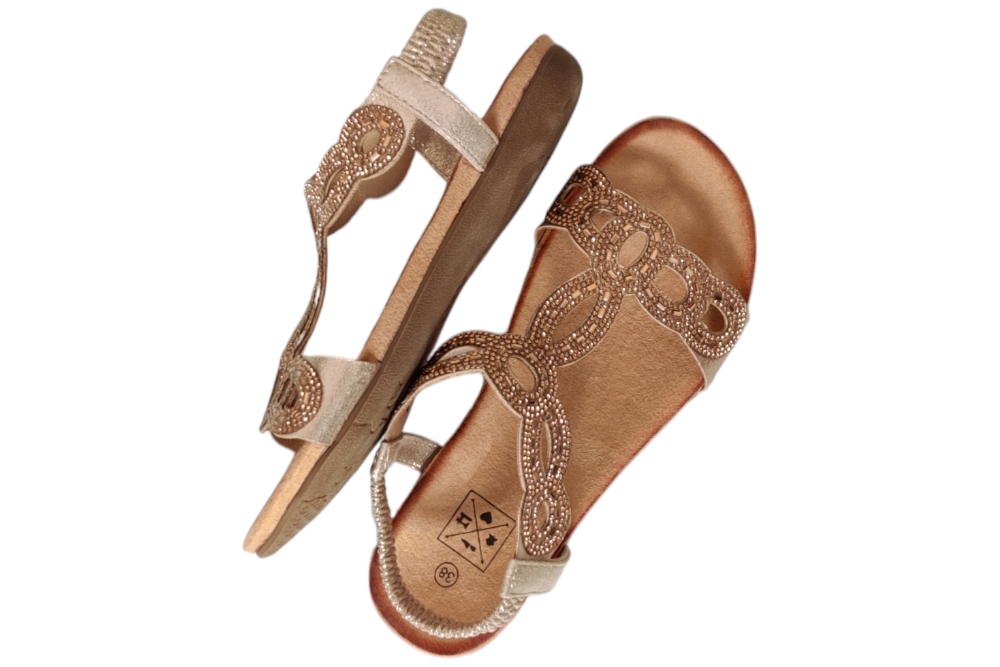 Sandaal van Bridge Footwear.Leuke elegante sandaal met wreef band en stras steentjes.Matriaal stof. Voering stof. Kleur goud. Zool rubber ca 1 cm.