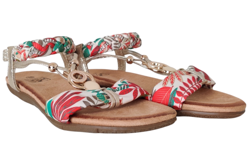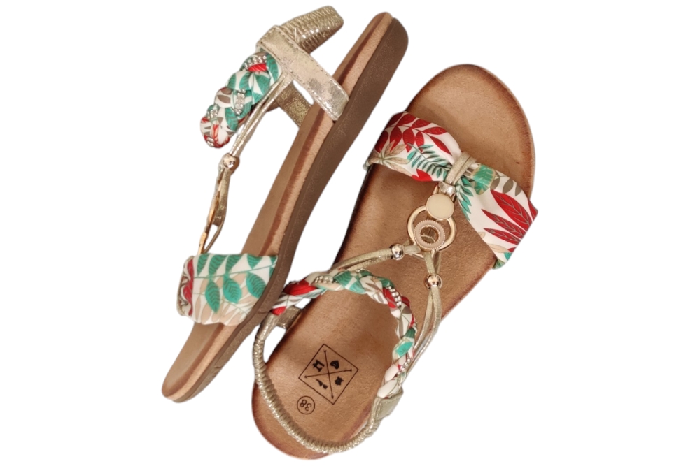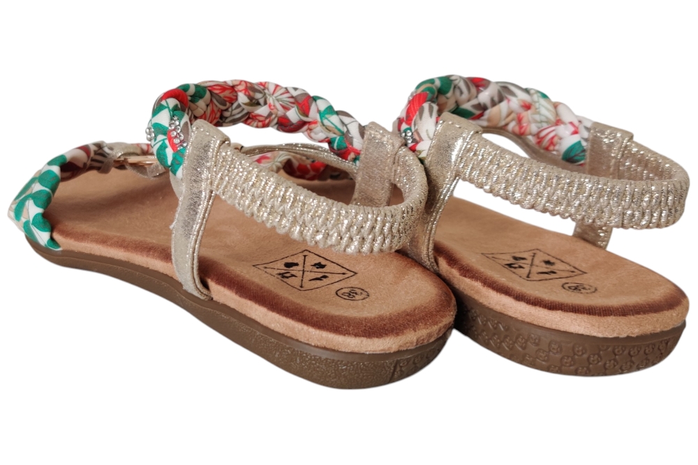 Sandaal van Bridge Footwear.Leuke elegante sandaal met wreef band en stras steentjes.Matriaal stof. Voering stof. Kleur goud. Zool rubber ca 1 cm.