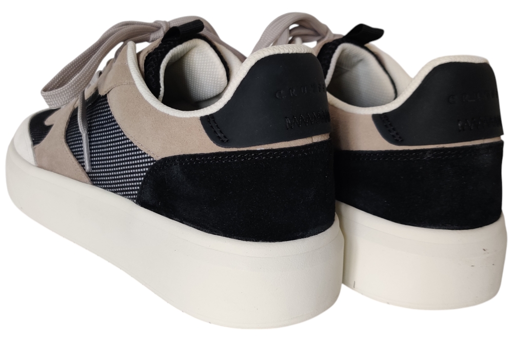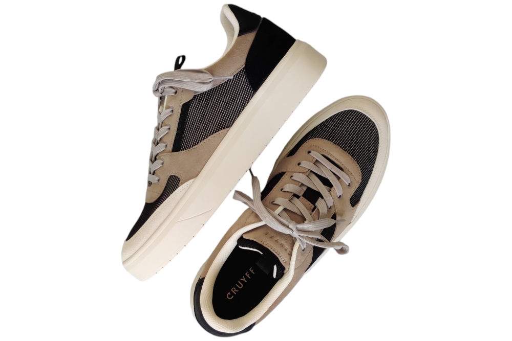 Heren sneaker van Cruyff. Basic zwart beige sneaker. Materiaal:suede stof. Voering: textiel. Losse binnenzool.Kleur: zwart beige. Zool: rubber. Hakhoogte: ca 3 cm.