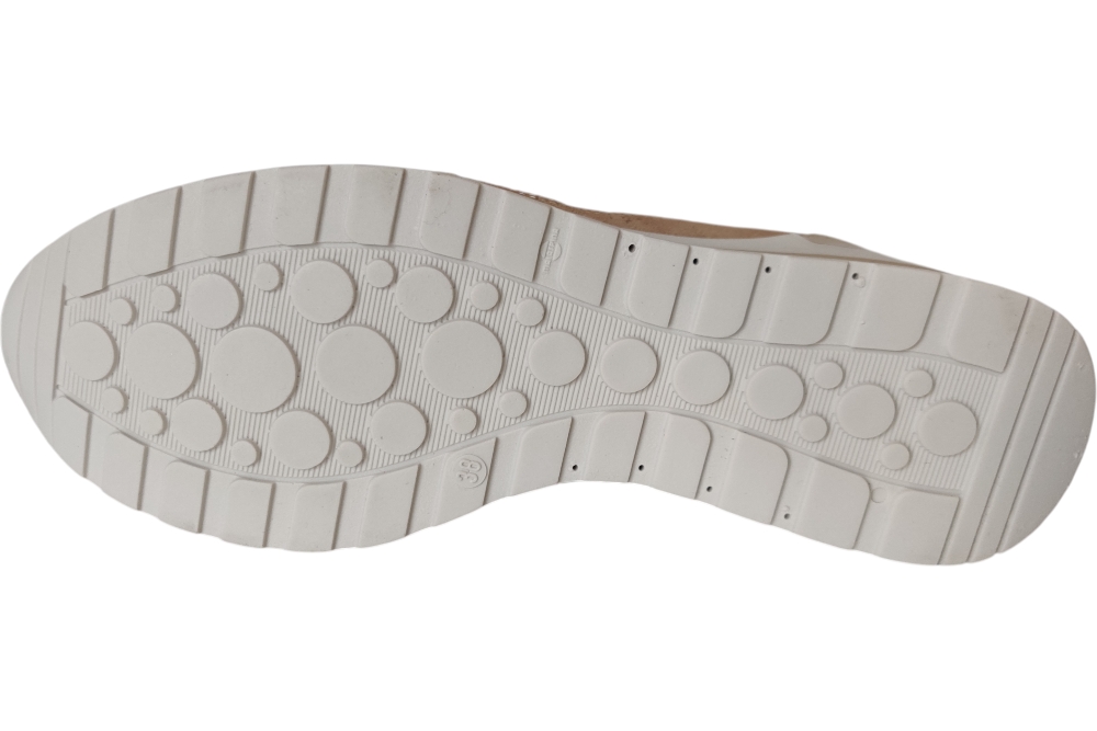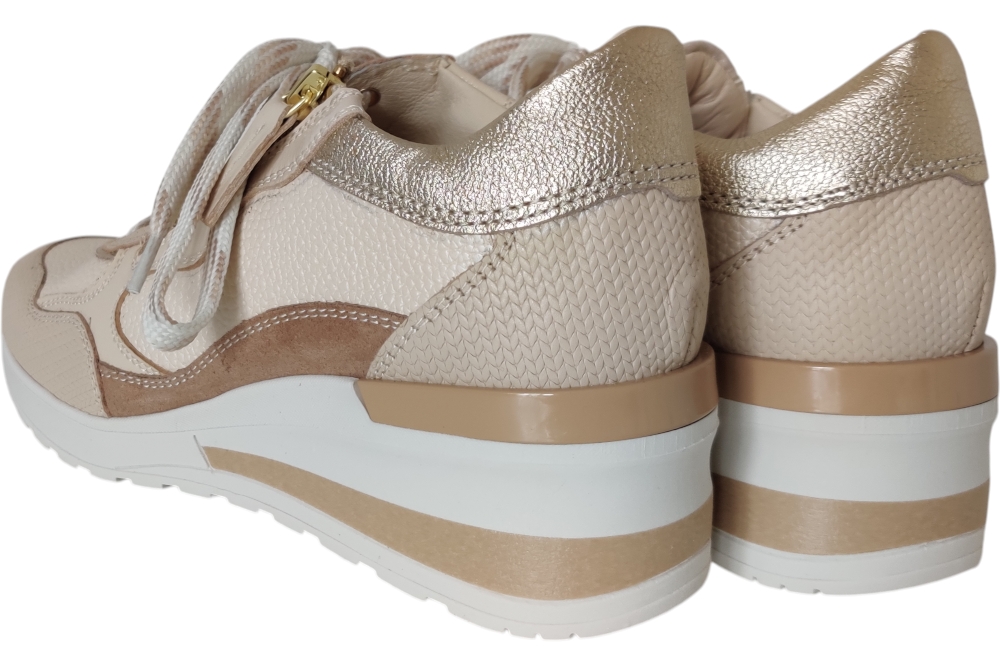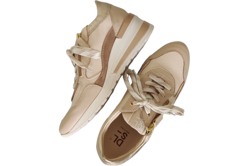 Sneaker van DL Sport. Deze sneaker heeft hogere hak en een losse binnenzool.Met een vetersluiting en een rits. Matriaal leer combi. Kleur beige goud.Voering leer. Zool rubber ca 4 cm
