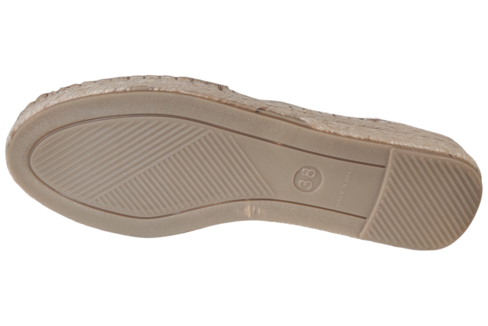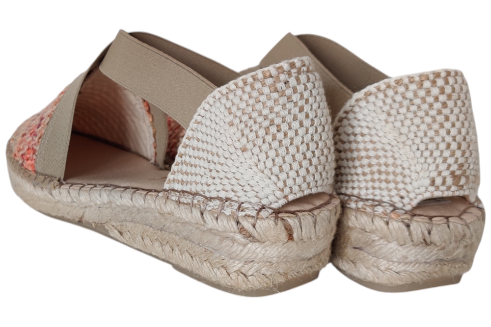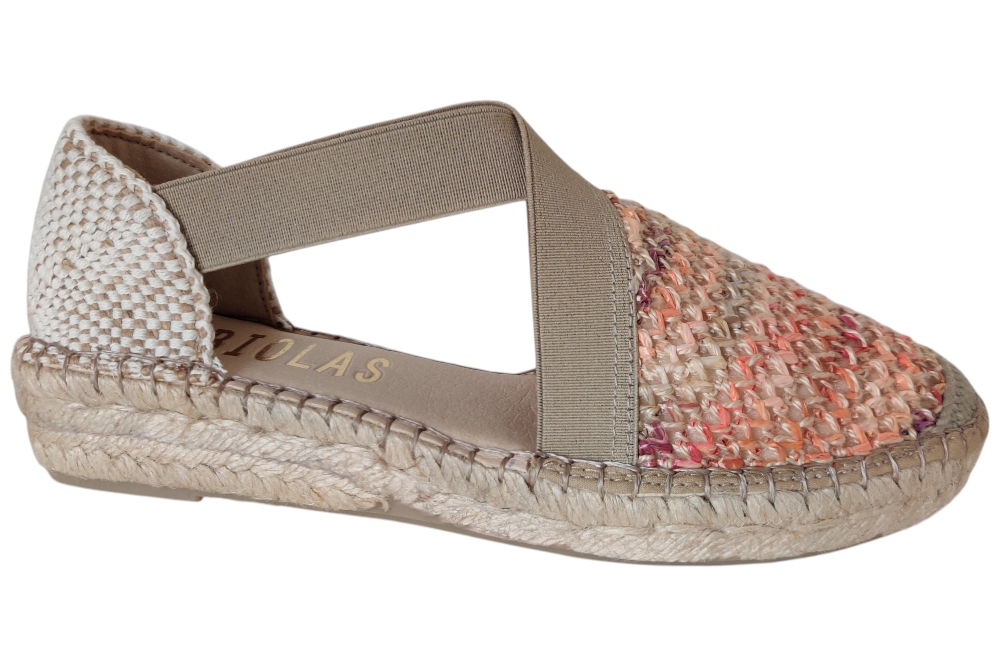 Sandaal van Fabiolas. Soepele sandaal in espedrile stijl op zacht voetbed.Elastische kruisband elastiek op de wreef. Matriaal stof combi.Kleur multi coller. Voering stof leer. Zool rubber ca 4 cm