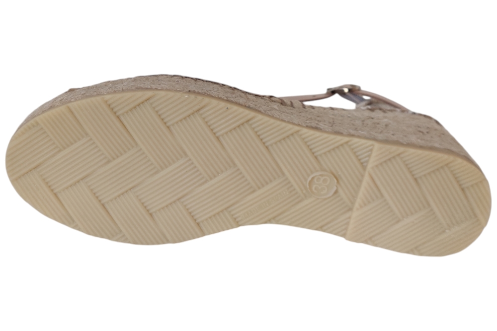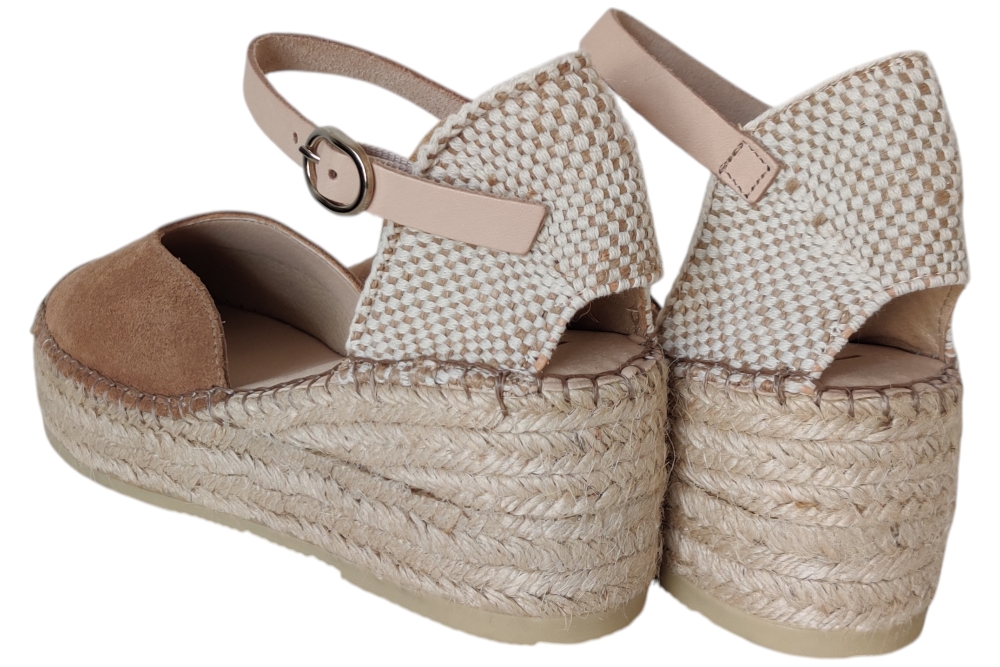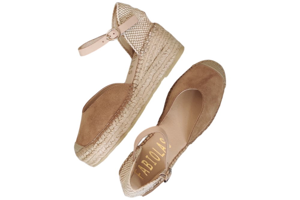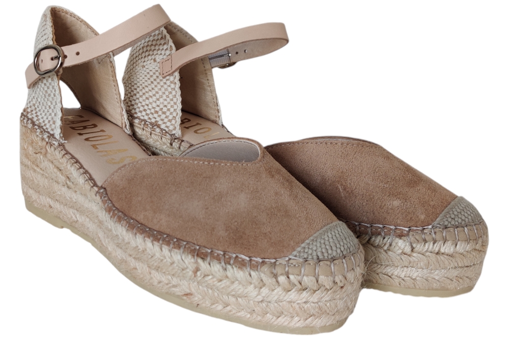 Sandaal van Fabiolas. Soepele sandaal in espedrile stijl op zacht voetbed. Met gesp sluiting om de enkel. Matriaal suede combi.Kleur beige. Voering leer. Zool rubber ca 4 cm