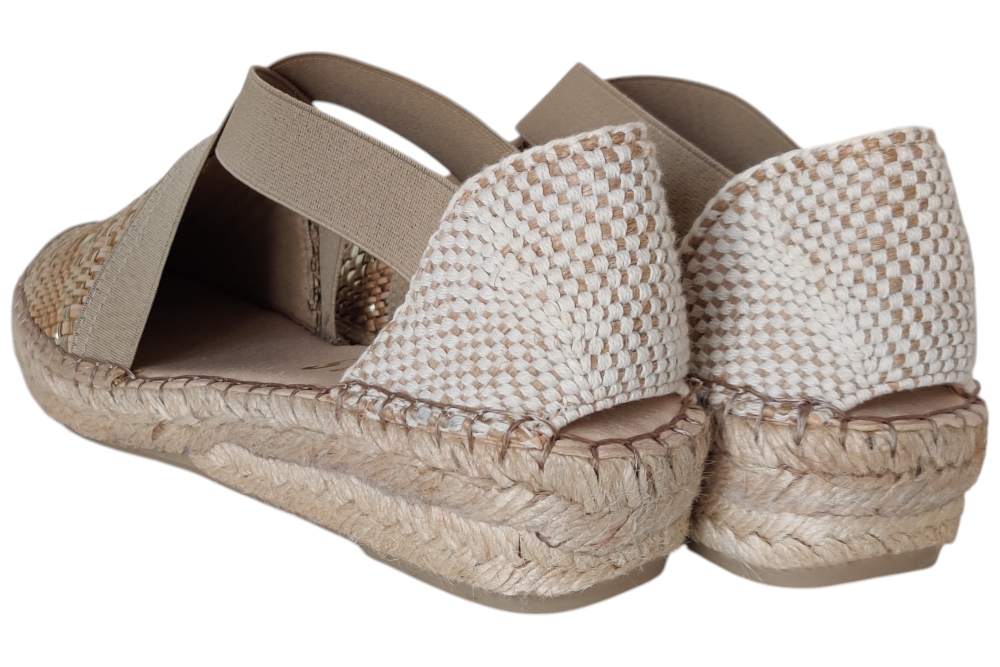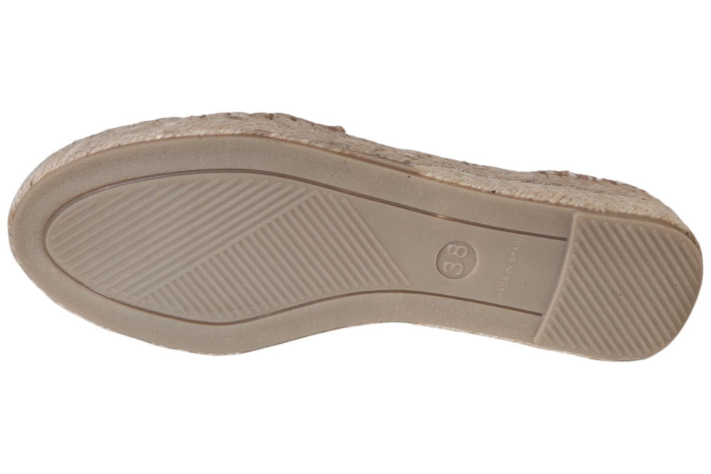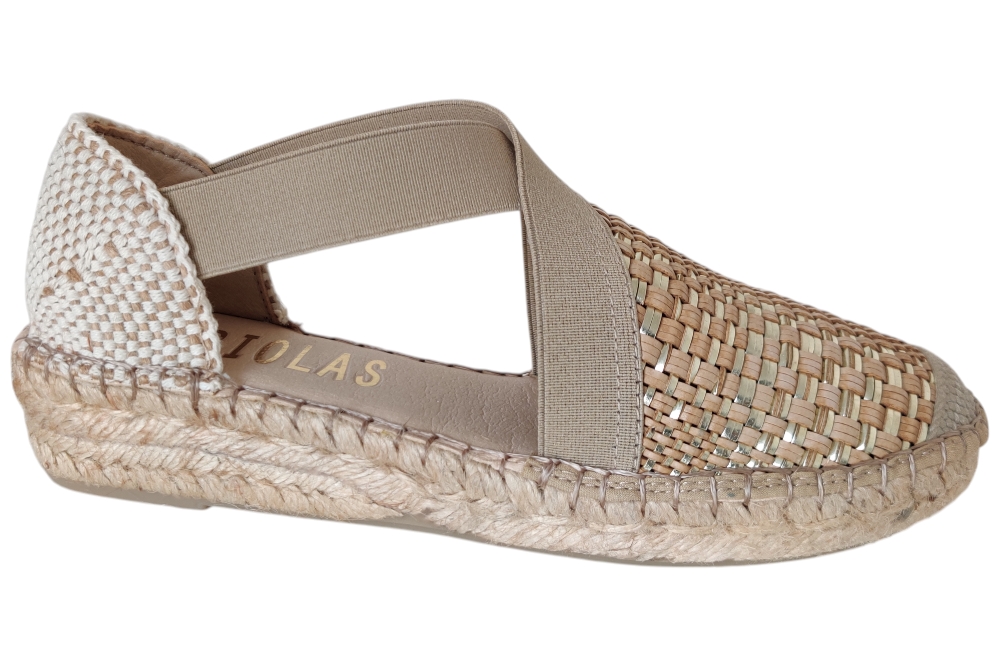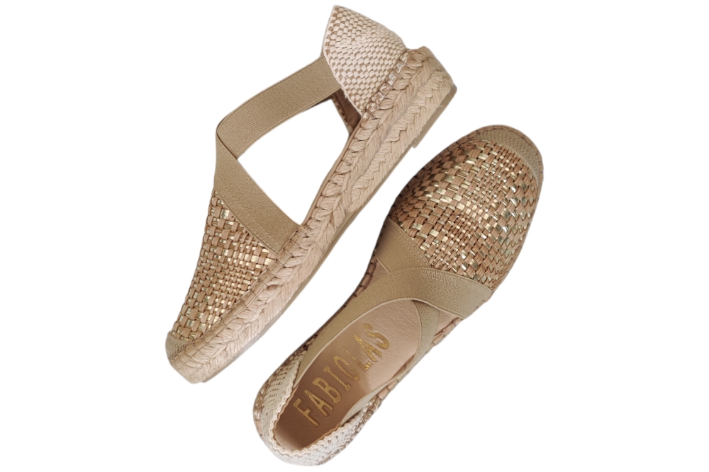 Sandaal van Fabiolas. Soepele sandaal in espedrile stijl op zacht voetbed.Elastische kruisband elastiek op de wreef. Matriaal suede leer combi.Kleur beige goud. Voering leer. Zool rubber ca 4 cm