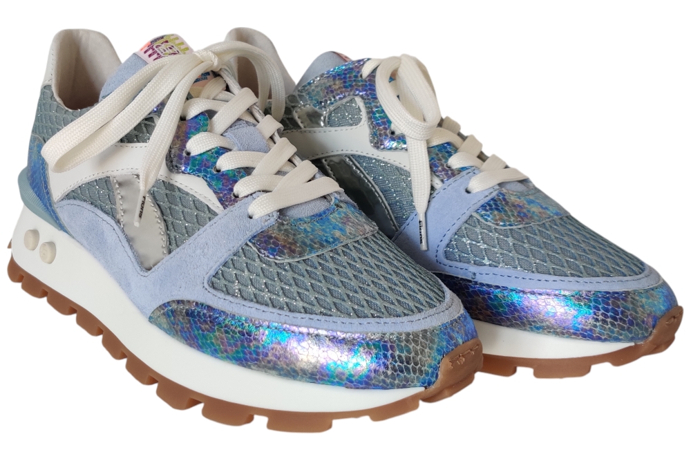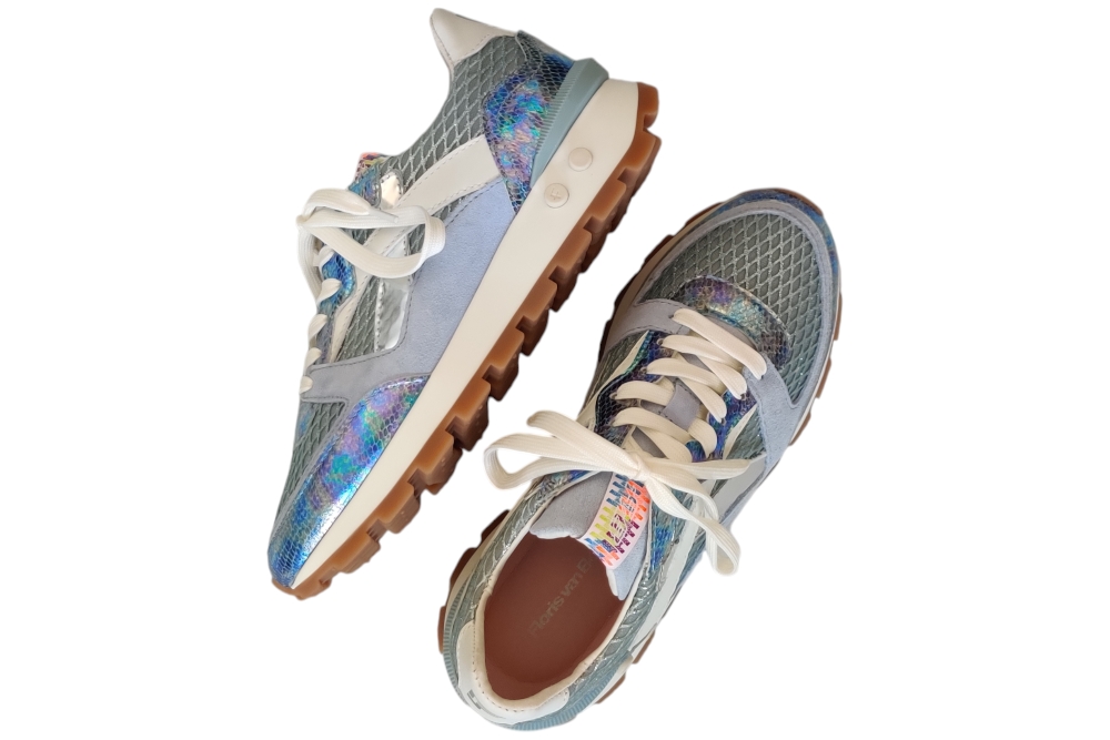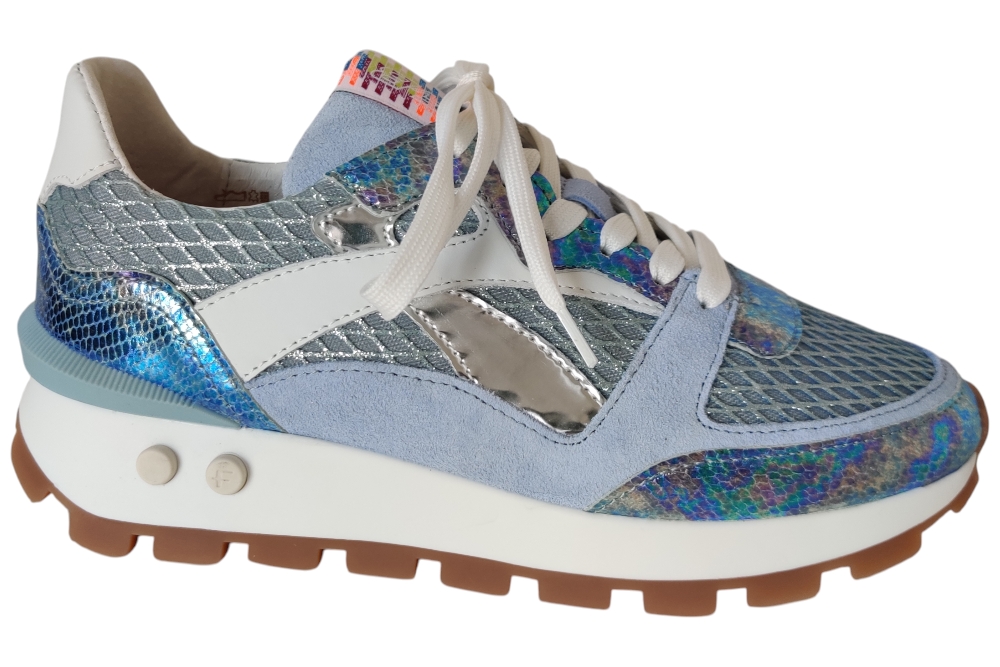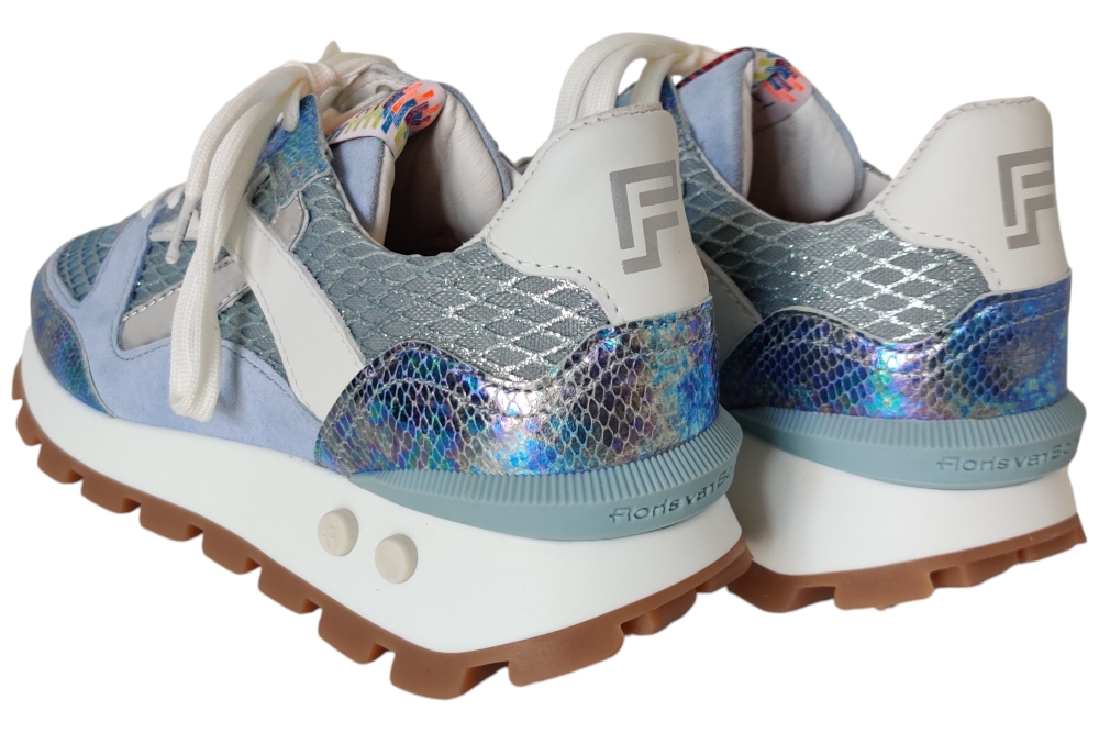 Dames sneaker van Floris van Bommel. Sneaker in een combinatie Leer. Materiaal: leer . Voering: leer. Kleur:blauw zilver combi.Heeft een losse binnenzool. Zool: rubber. Hakhoogte: ca 3 cm.