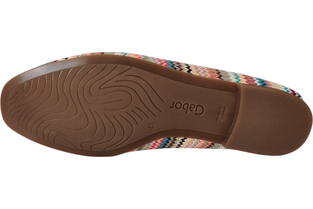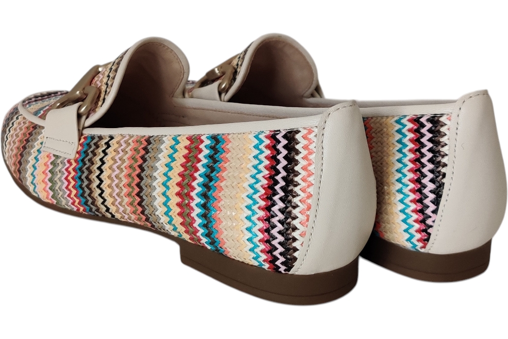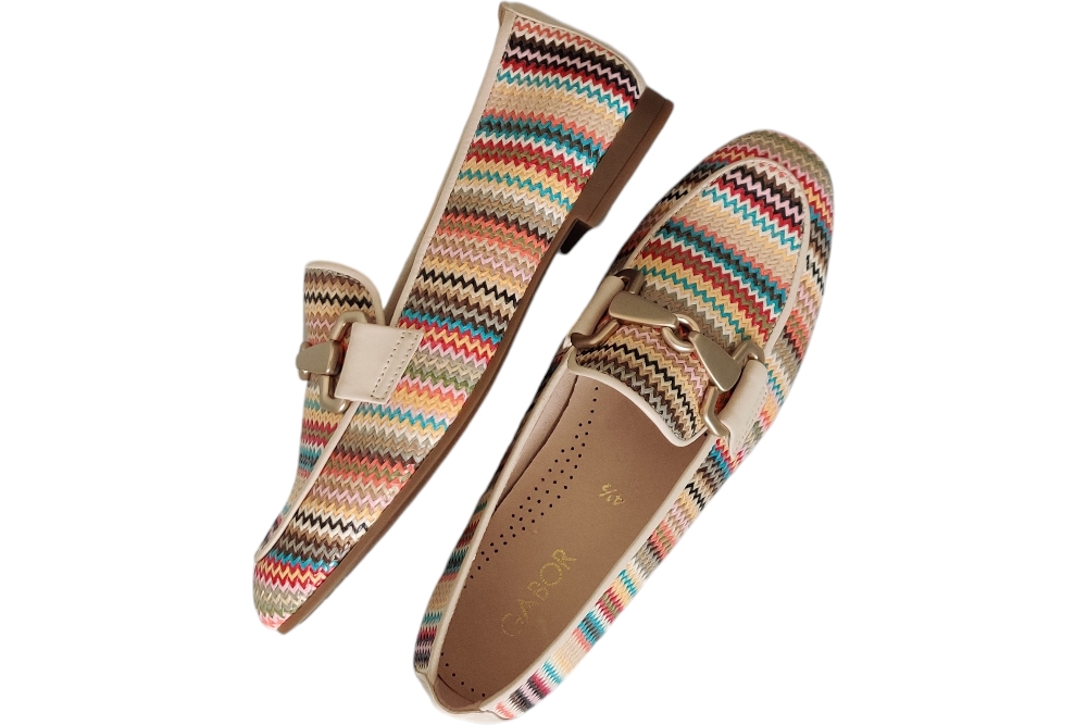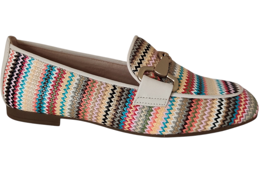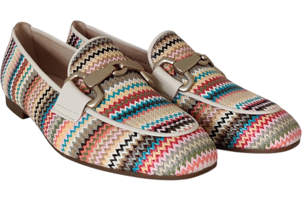 Dames moccasine instapper van Gabor. Moccasine in raffial met bitje op de wreef. Matriaal vlechtstof. Voering leer Zool rubber ca 1cm.