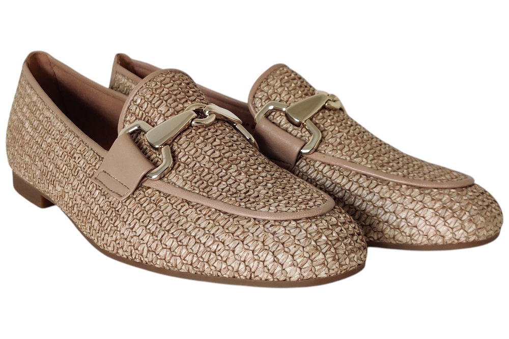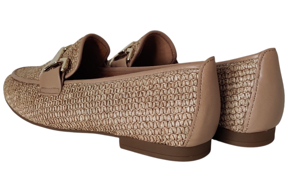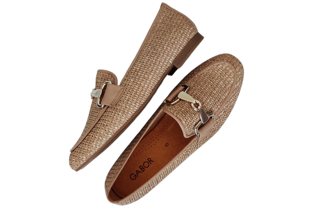 Dames instapper van Gabor. Moccasine in raffialeer met bitje op de wreef. Matriaal leer. Voering leer Zool rubber ca 1cm.