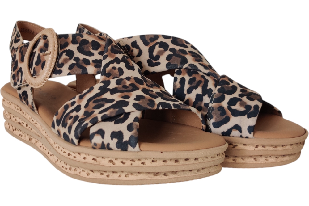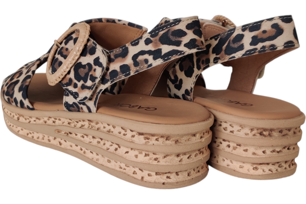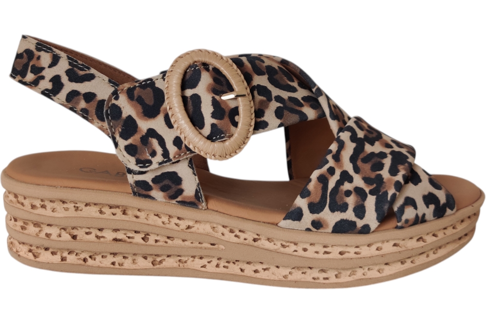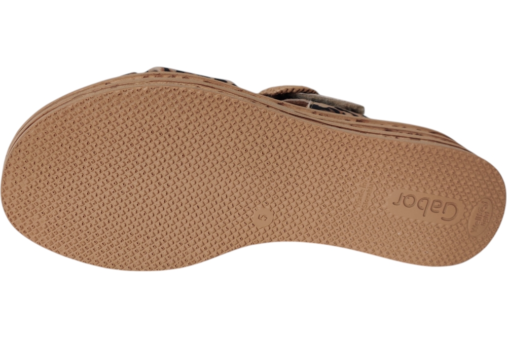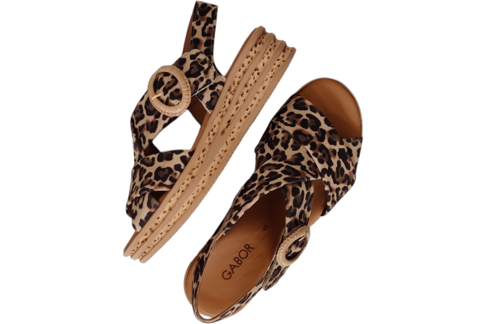 Dames sandaal van Gabor. Sandaal met panterprint. Deze sandaal heeft een verstelbare wreefband op een plateau zool. Materiaal: nubuck. Voering: leer. Kleur: Bruin combi. Zool: rubber. Hakhoogte: ca 4 cm.