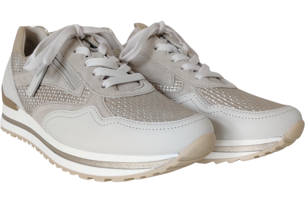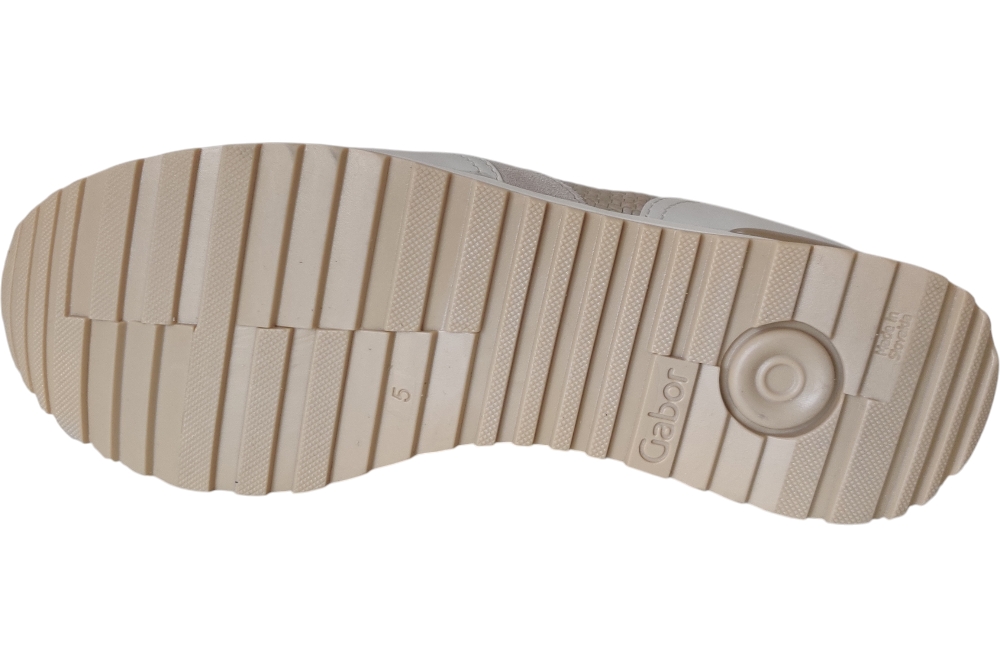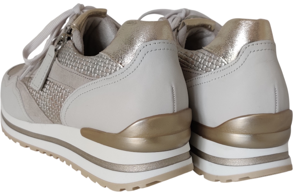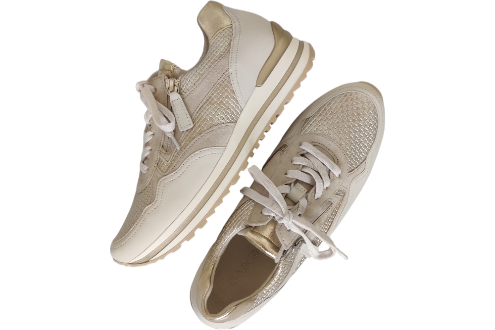 Dames sneaker van Gabor. Sneaker in printleer met uitneembaar voetbed. Materiaal:leer combi Voering: leer. Kleur: brons. Zool: rubber. Hakhoogte: ca 3 cm.