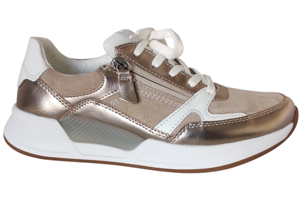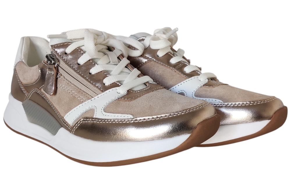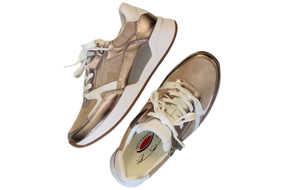 “Dames sneaker van Rolling soft Gabor. Sneaker met uitneembaar voetbed. Materiaal: suede leer combi Voering: leer. Kleur: multi collor. Zool: rubber. Hakhoogte: ca 3 cm.