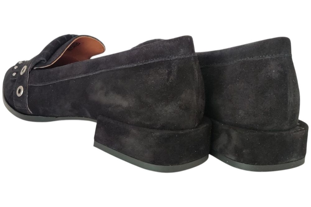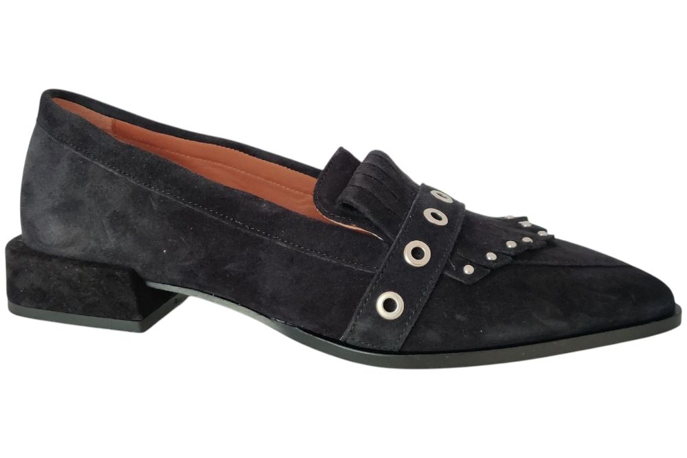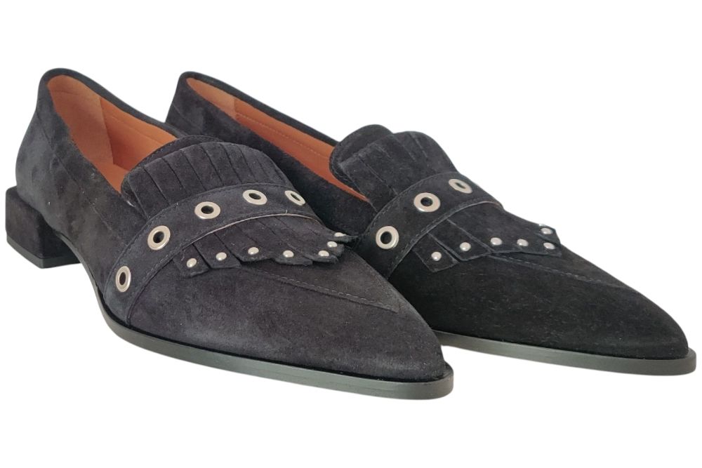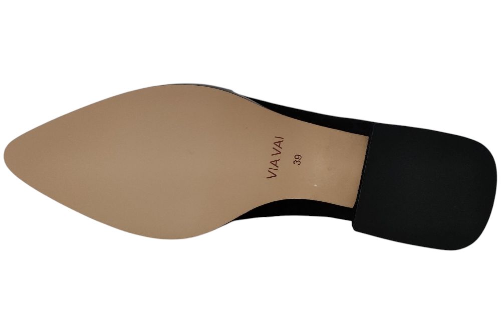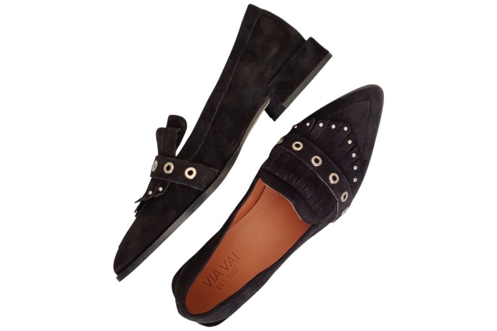 Instapper van Via Vai. Deze instapper in mocassin stijl met stuts op spitse leest. Materiaal: suede. leer gevoerd. Kleur: zwart. Zool: rubber.