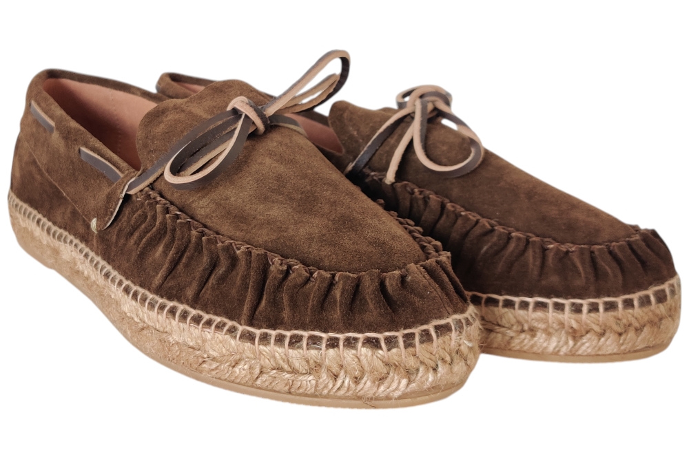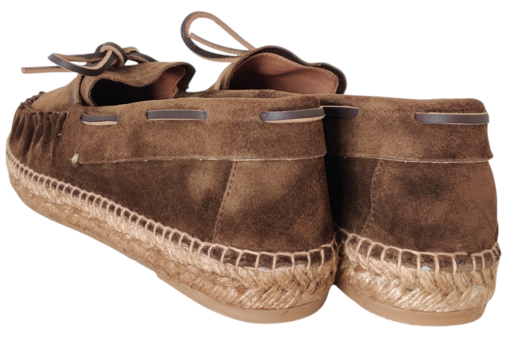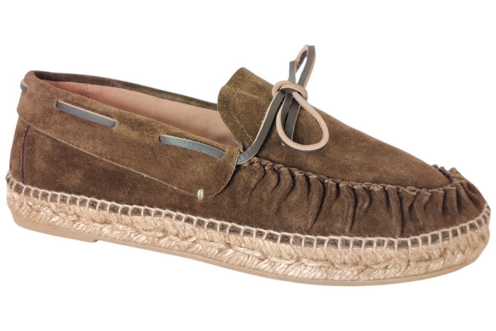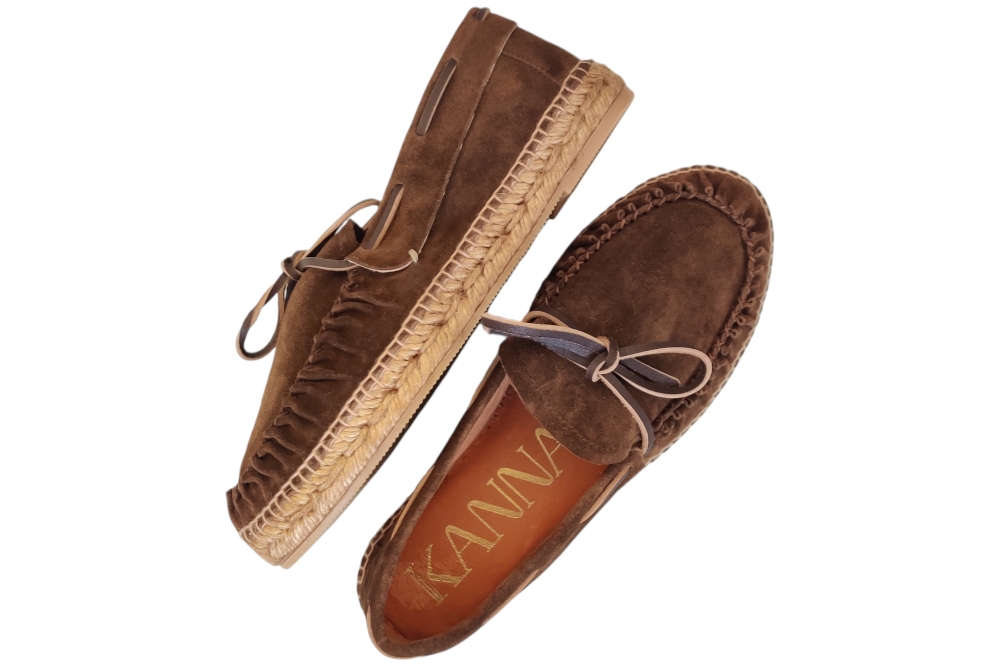 Instapper van Kanna. Hippe bootschoen in espedrille stijl van Kanna in het suede met lerenveter.Matriaal suede Voering leer. Kleur bruin. Loopzool rubber ca 2 cm.
