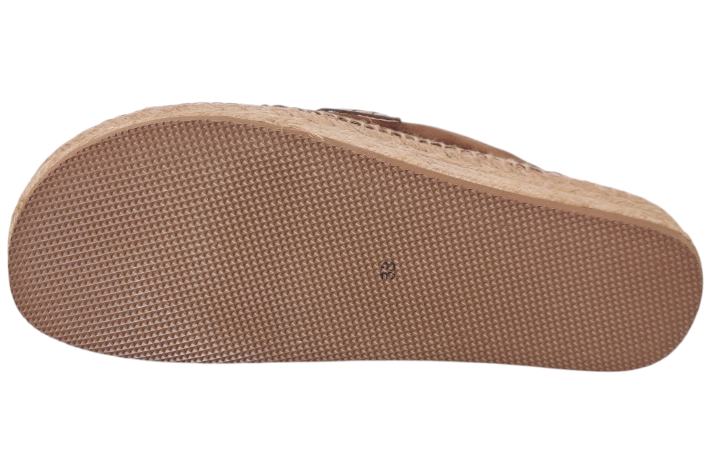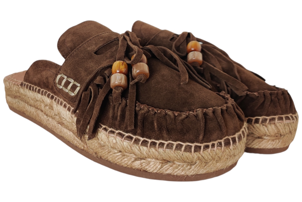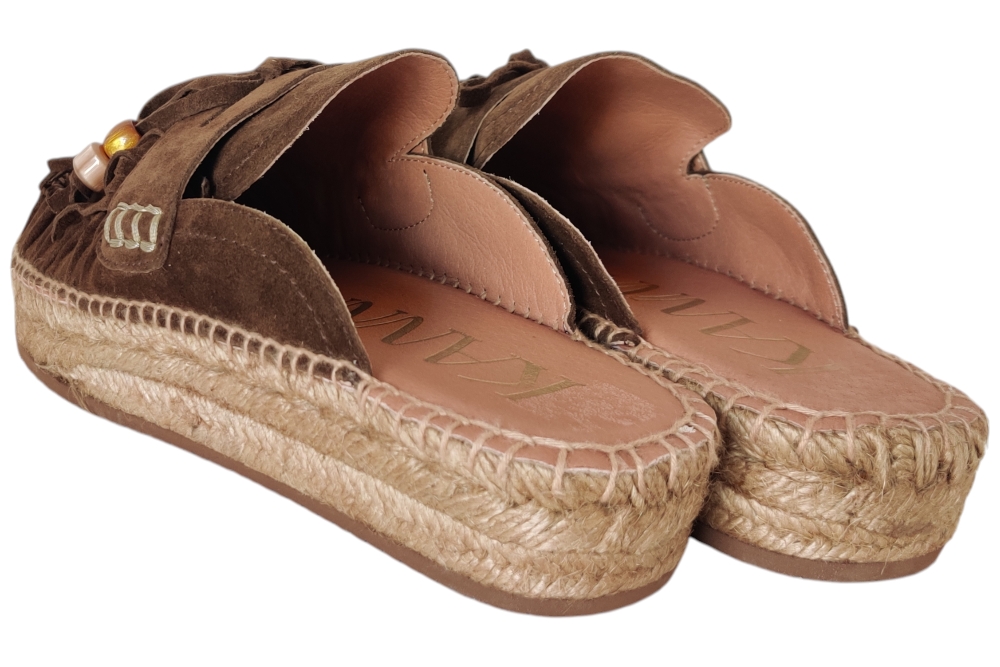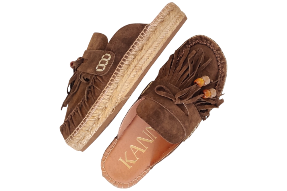 Slipper van Kanna. Hippe slipper in espedrille stijl van Kanna in het suede met wreefband met flosjes en kralen..Matriaal suede Voering leer. Kleur bruin.. Loopzool rubber ca 2 cm.