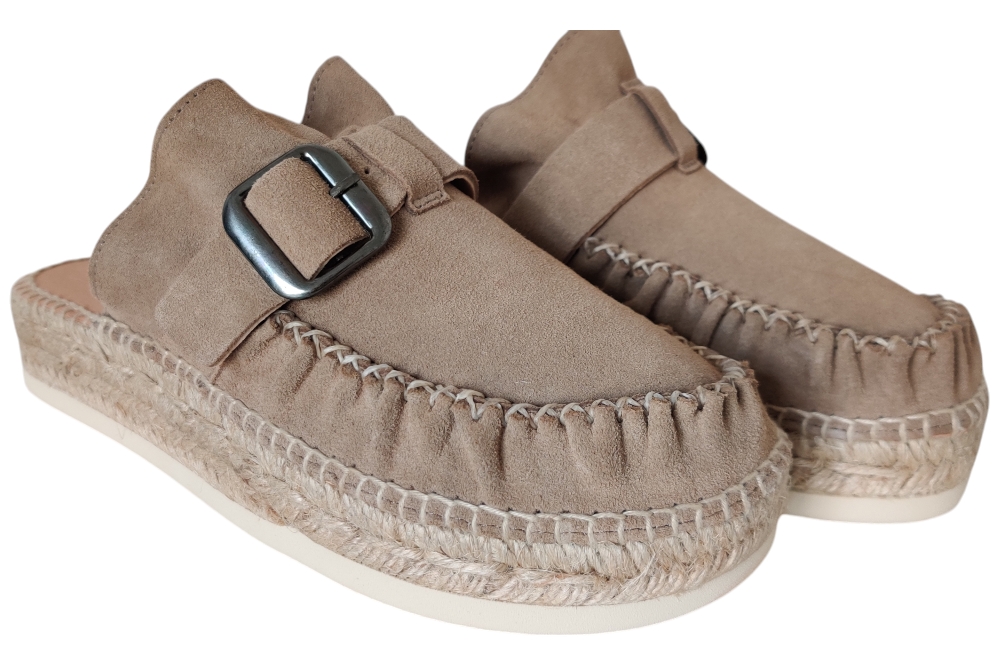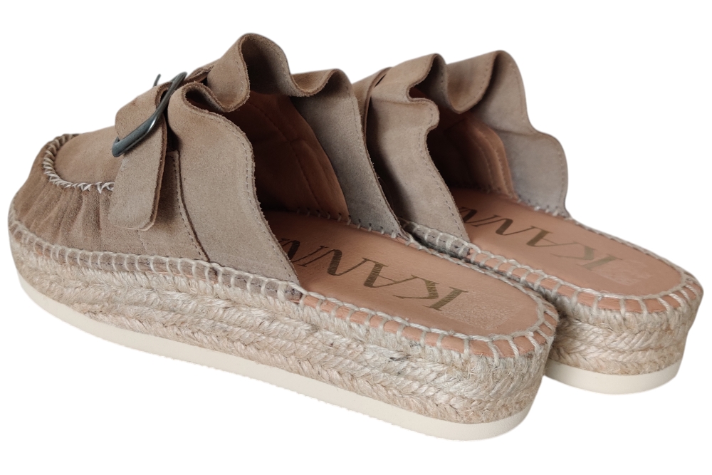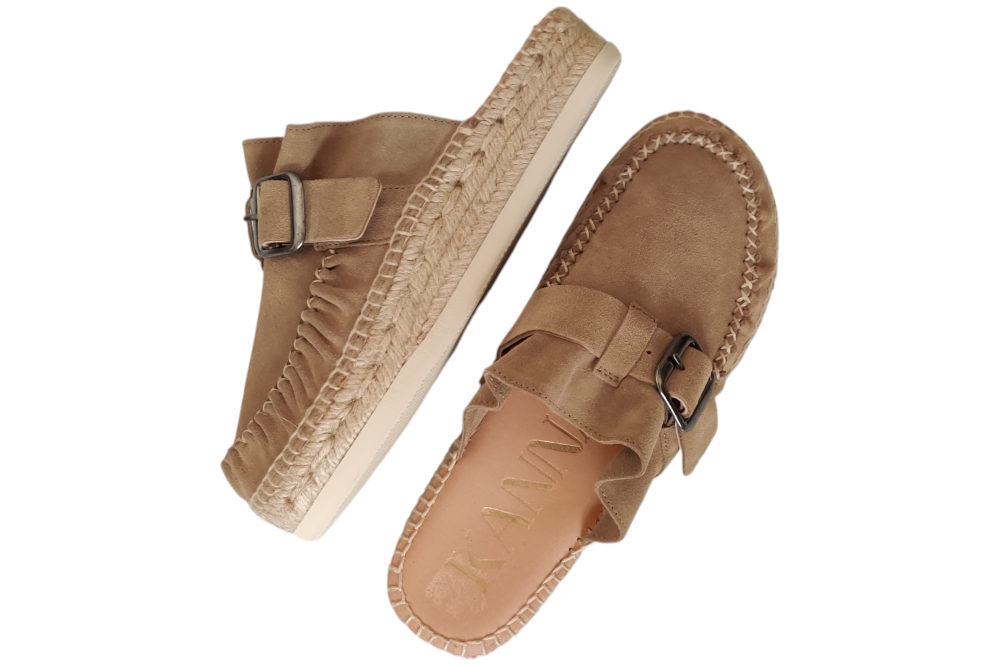 Slipper van Kanna. Hippe slipper in espedrille stijl van Kanna in het suede met wreefband en gesp sluiting.Matriaal suede Voering leer. Kleur beige. Loopzool rubber ca 2 cm.