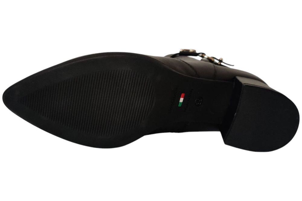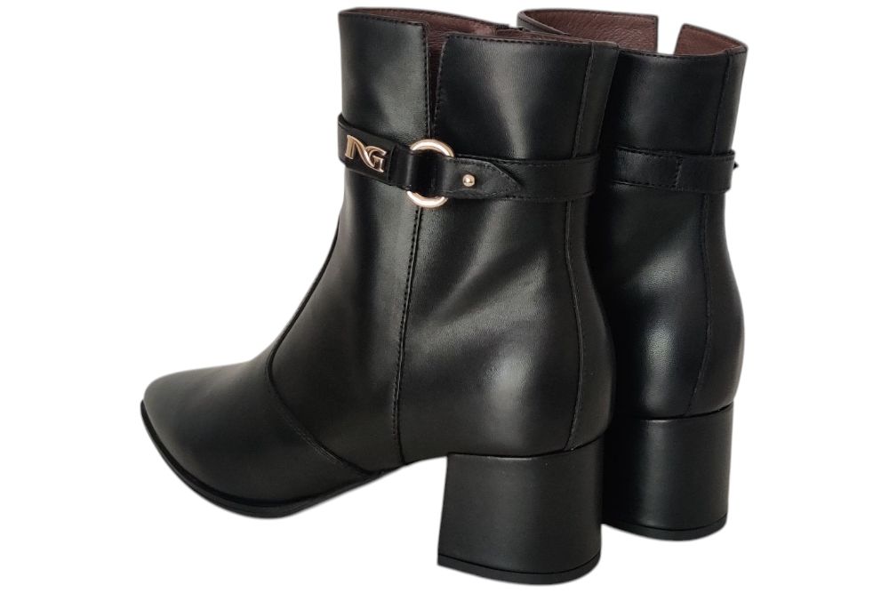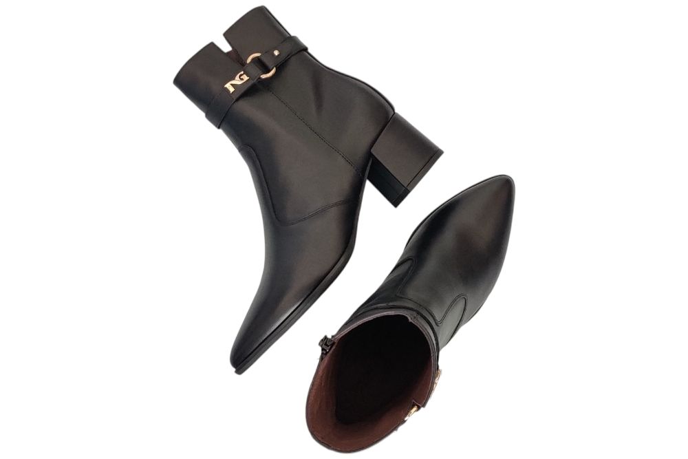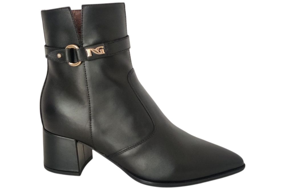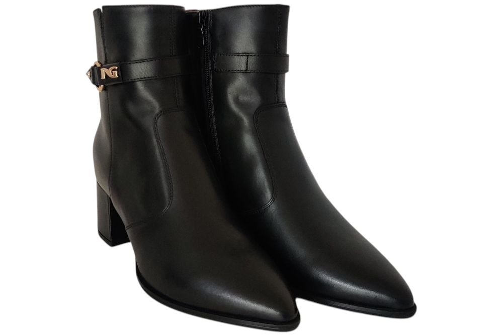 Dames laarsje van Nero Giardini . Dit laarsje heeft gesp boven aan de schagt. Materiaal: Leer. Voering: leer. Kleur: zwart. Zool: rubber. Hakhoogte: ca 5 cm.