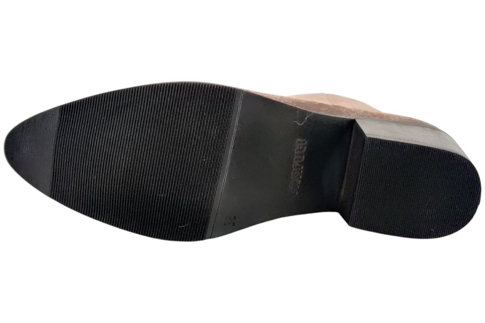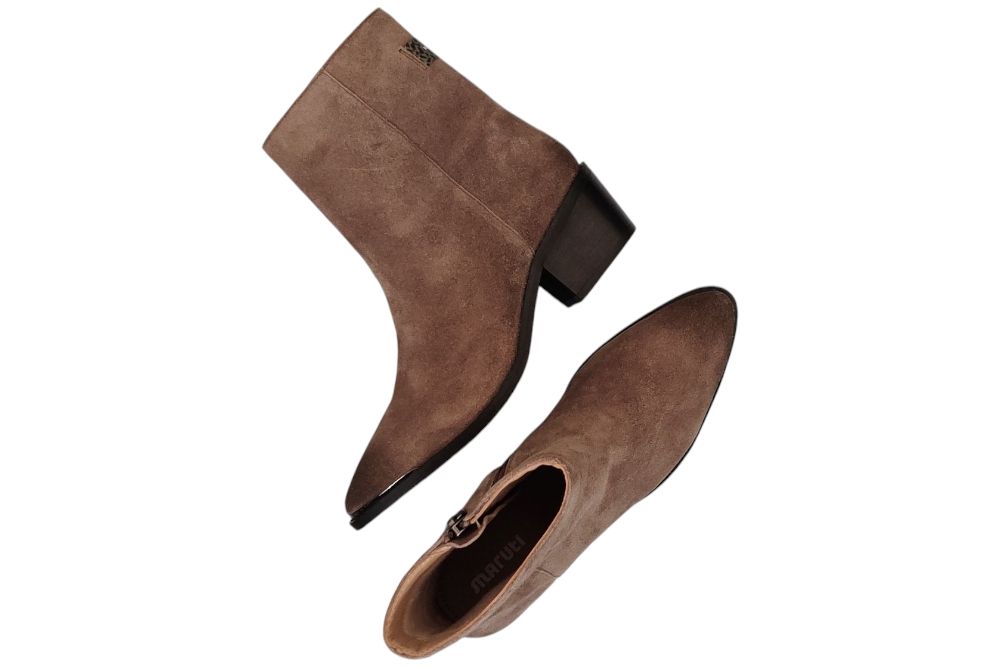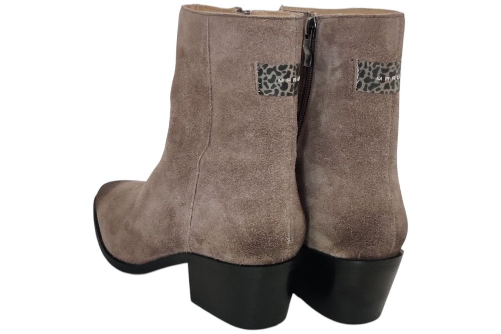 Dames enkellaars van Maruti. Enkellaars in westernstijl. Materiaal: suede. Voering: deels leer. deels textiel. Kleur: taupe. Zool: antislip. Hakhoogte: ca 4 cm.
