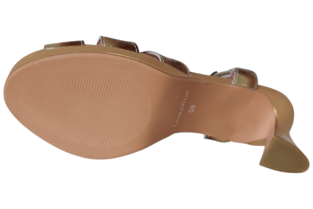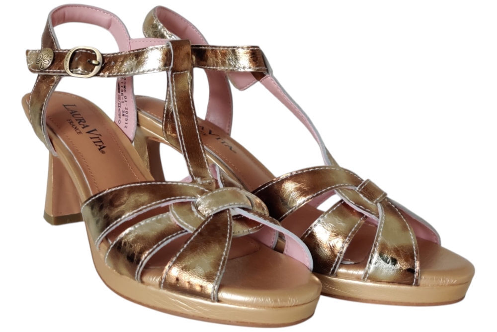 Sandaal van Laura Vita. Deze kleurrijke elegante sandaal heeft demping in de zool en is van soepel leer. Deze sandaal heeft klitteband sluitingen. Kleur brons. Matriaal leer. Voering leer. Hak ca 5 cm