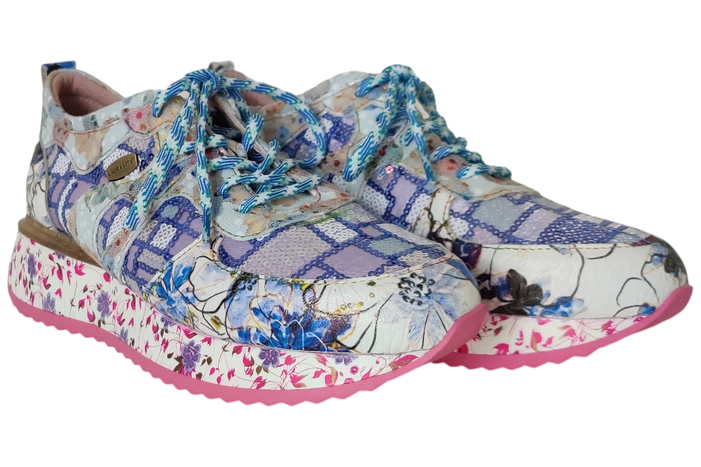 Dames sneaker van Laura Vita. Sneaker in verschillende materialen met uitneembaar voetbed. Materiaal: Leer combi. Voering: deels leer. deels textiel. Kleur: multi color paars. Zool: rubber. Hakhoogte: ca 4 cm.