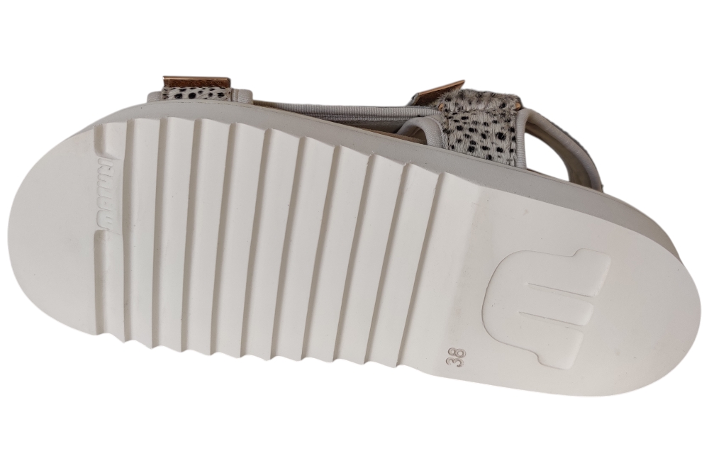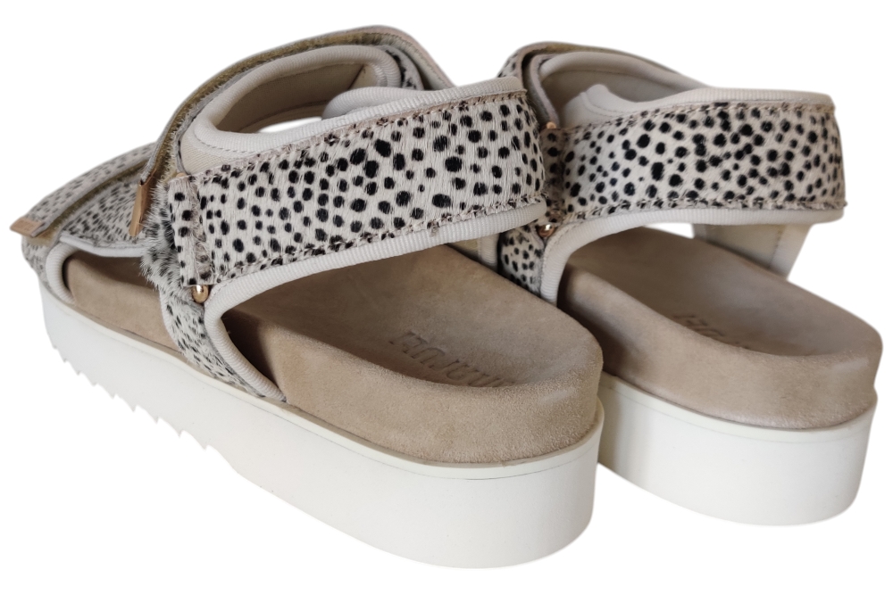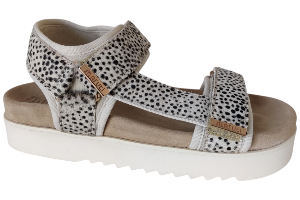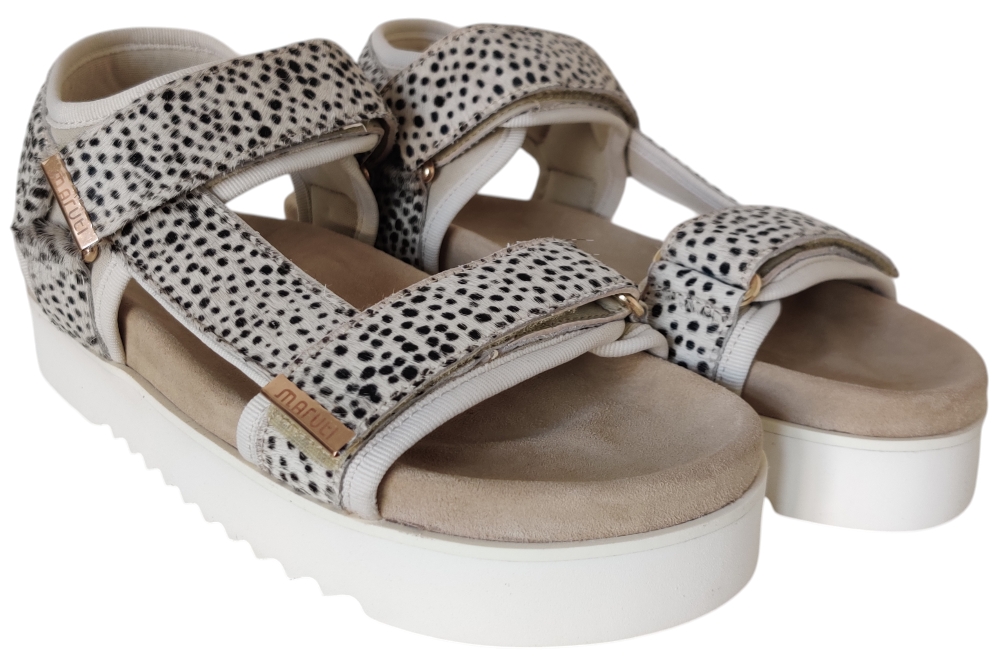 Dames sandaal van Maruti. Sandaal met verstelbare wreefbanden, op een plateau zool. Materiaal: Leer. Voering: stof. Kleur: beige. Zool: rubber. Hakhoogte: ca 3 cm.