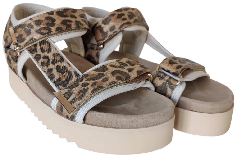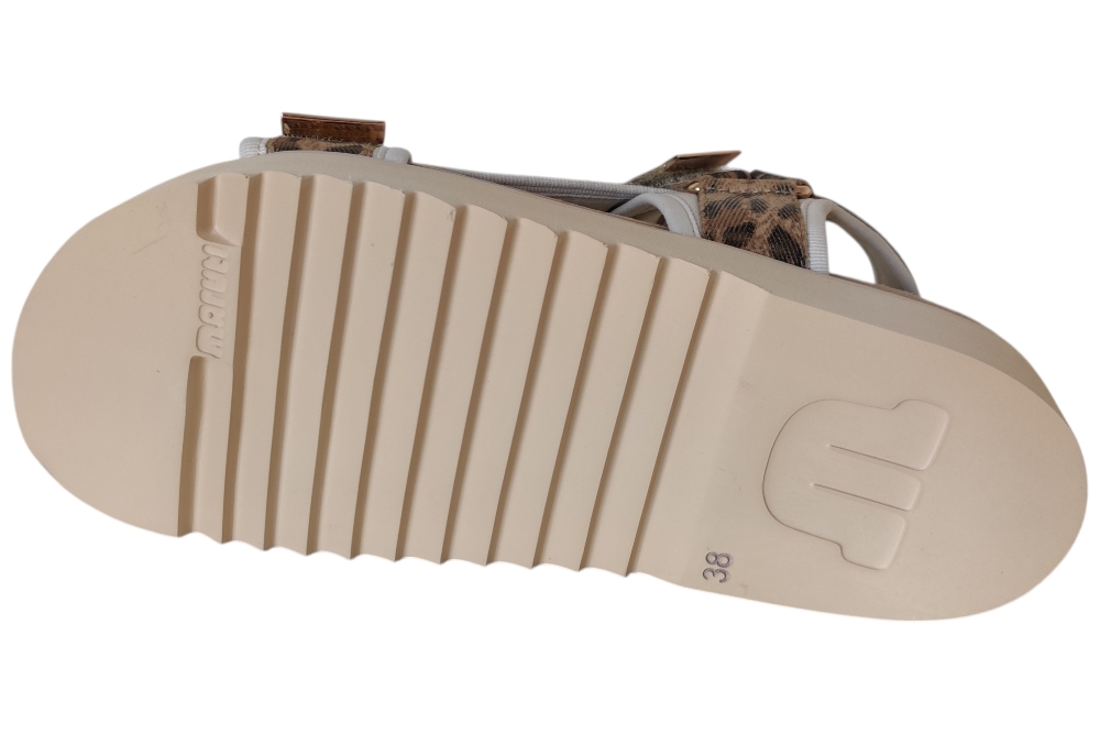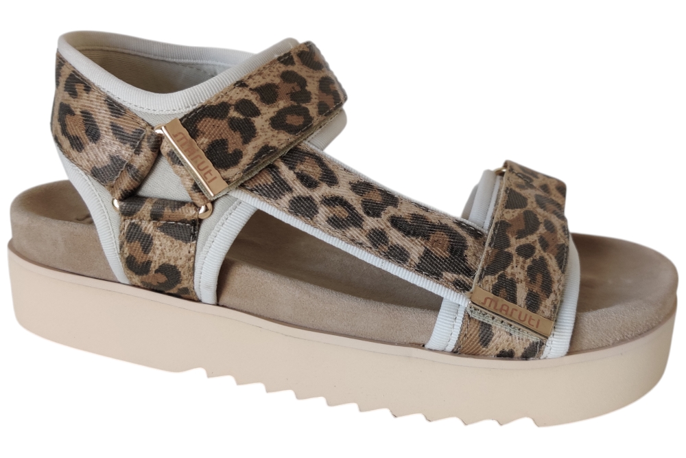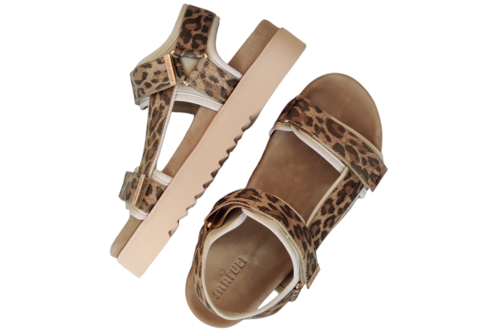 Dames sandaal van Maruti. Sandaal met verstelbare wreefbanden, op een plateau zool. Materiaal: Stof. Voering: stof. Kleur:bruin combi. Zool: rubber. Hakhoogte: ca 3 cm.