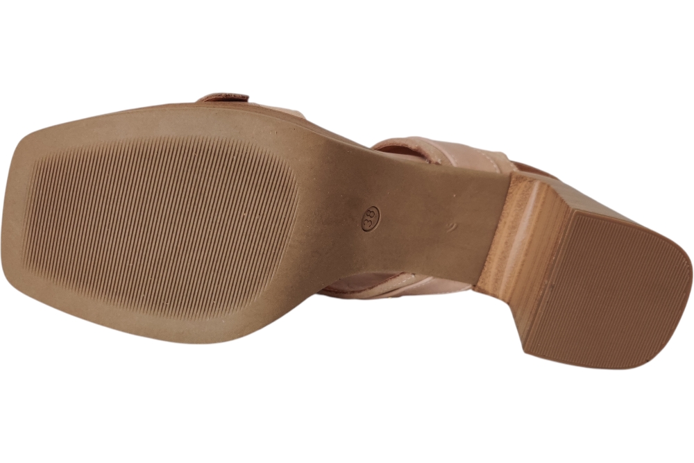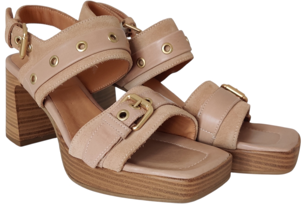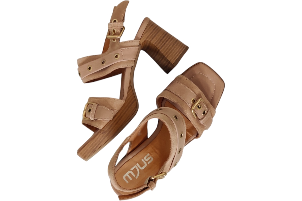 Dames sandaal van Mjus.Deze stoere sandaal heeft een wreefband met stuts.Een gesp sluiting op een hak.Matriaal leer suede. Voering leer. Zool antislip. ca7 cm.
