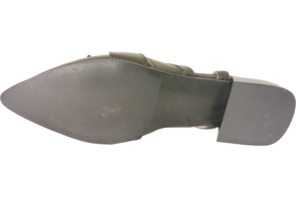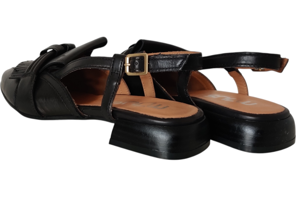 Dames slingpump van Mjus.Deze slingpump heeft een wreefband met vlect.Een gesp sluiting op een klein hakje.Matriaal leer. Voering leer.Kleur zwart. Zool antislip. ca2 cm.