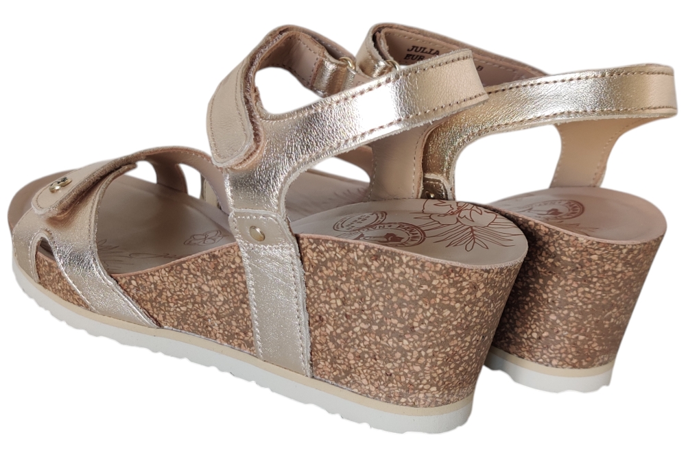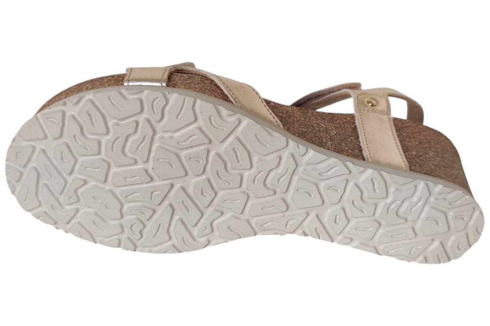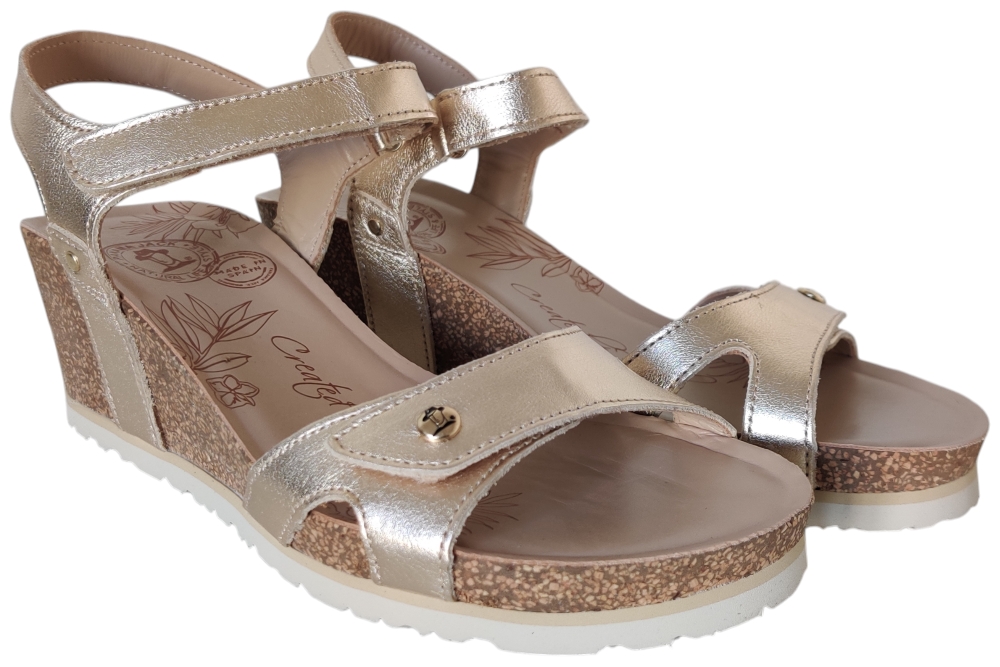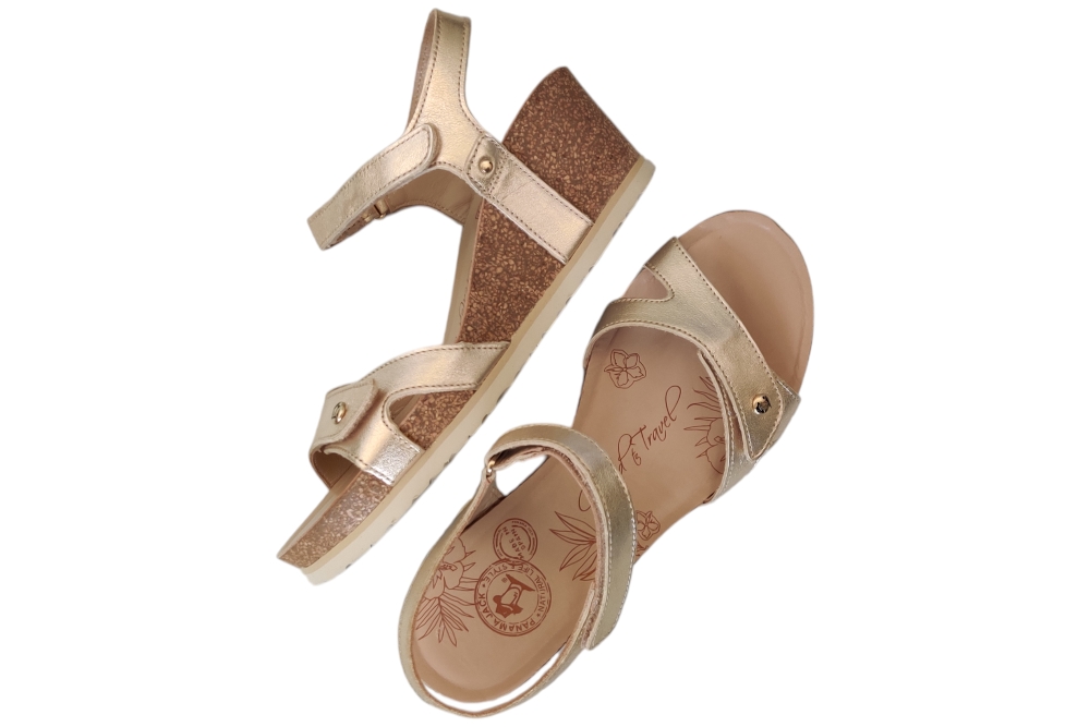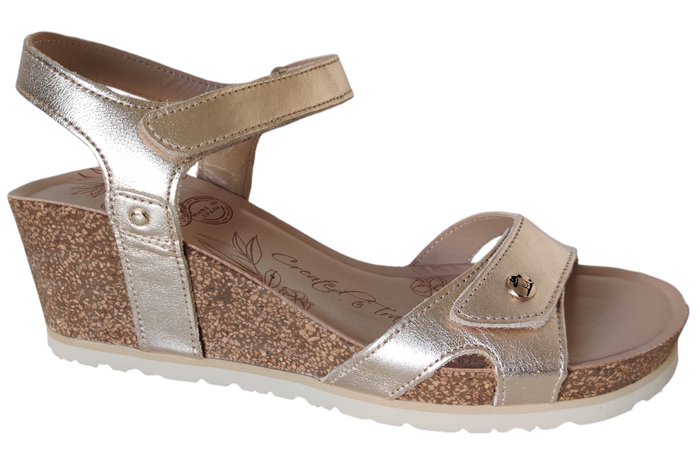 Sandaal van Panama Jack. Sandaal met goed voetbed. De sluiting bestaat uit twee klittebanden.Matriaal leer.Voering leer.Kleur goud..Zool rubber ca 4 cm