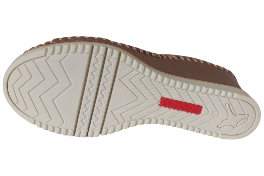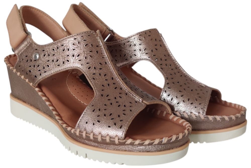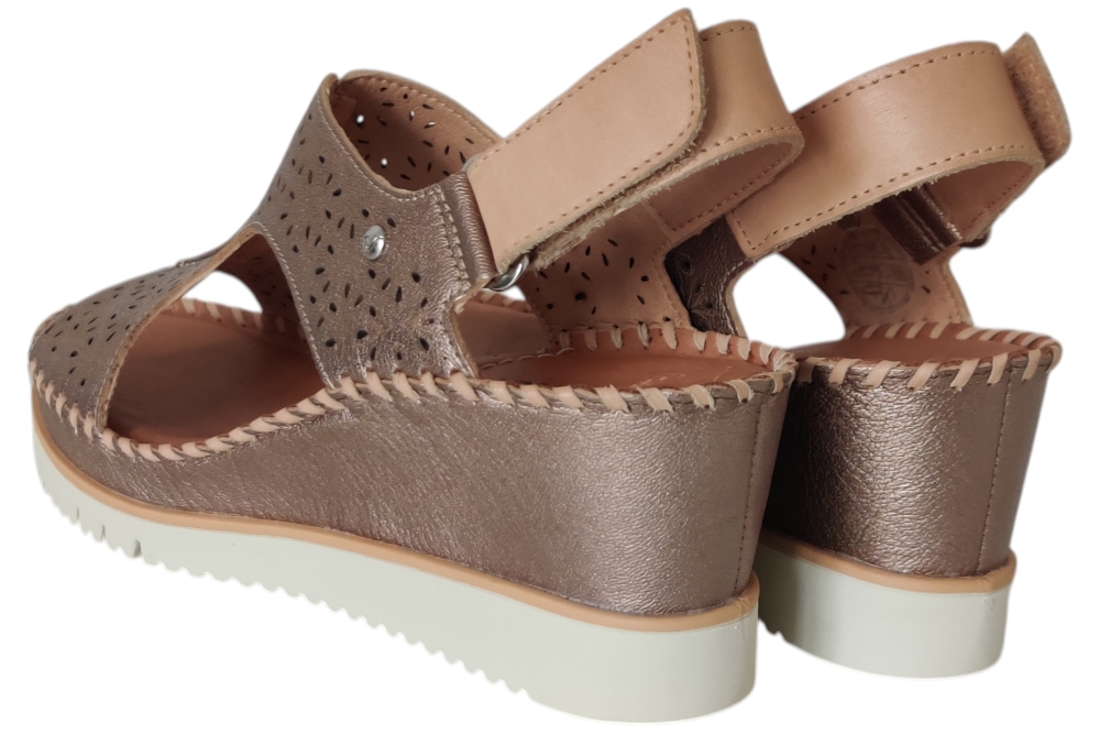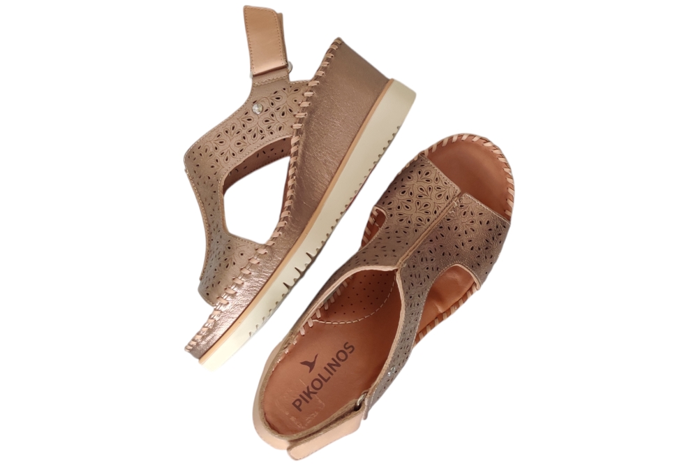 Sandaal van pikolinos. Deze sandaal heeft demping in de zool en is van soepel leer. Deze sandaal heeft een klitteband sluiting. Kleur brons. Matriaal leer. Voering leer. Hak ca 4 cm
