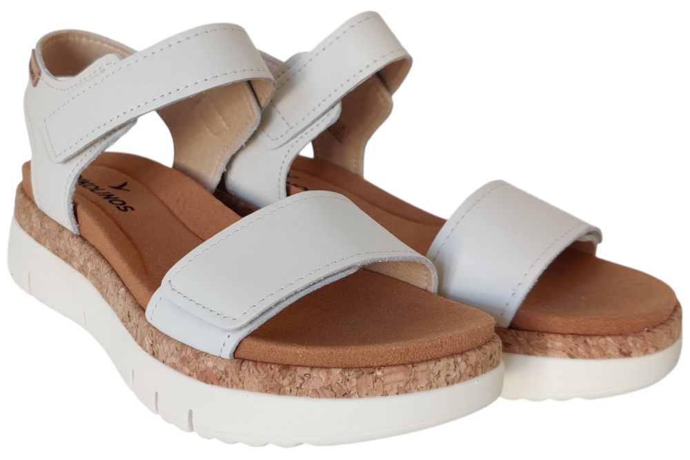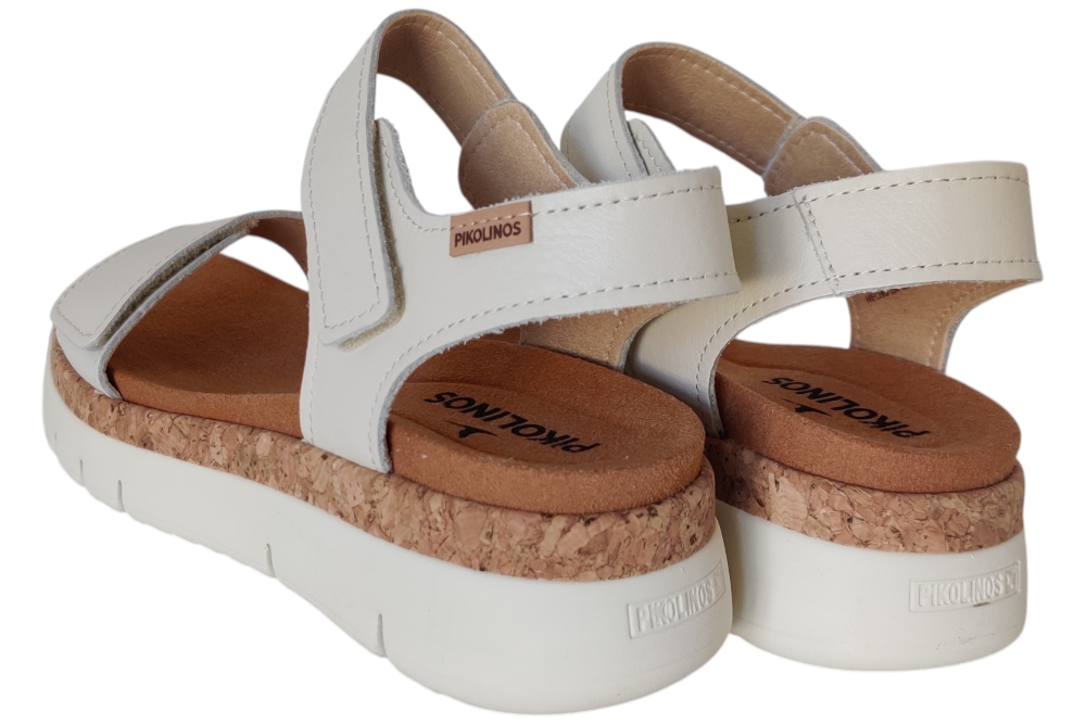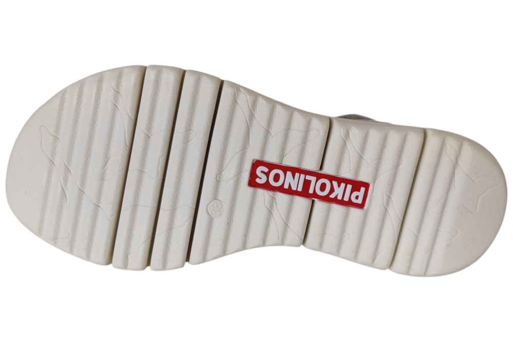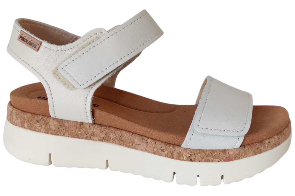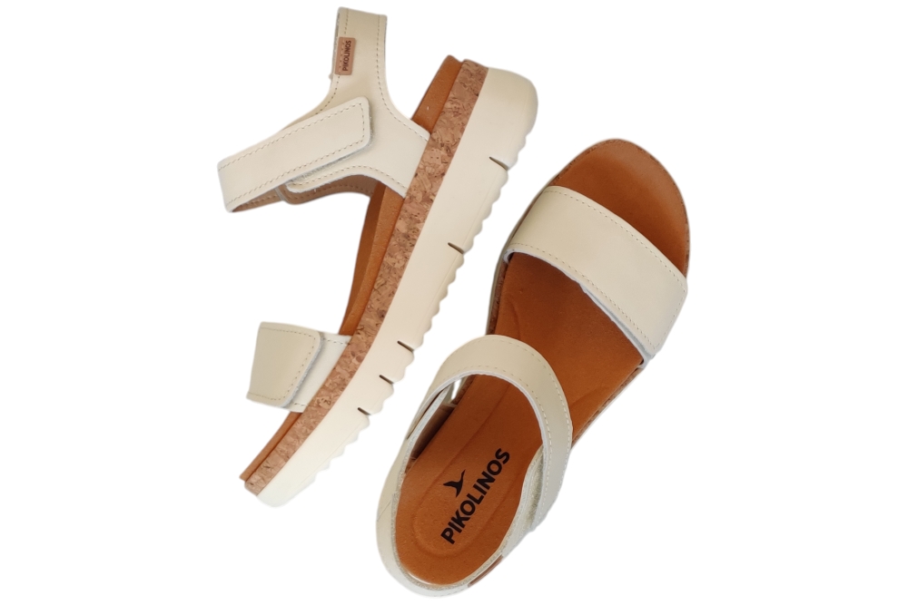 Sandaal van pikolinos. Sandaal met een comfortabel voetbed. Deze sandaal heeft plateau zool en twee klittebanden om in te stellen. Matriaal leer. Voering leer. Kleur beige. Zool ca 4 cm