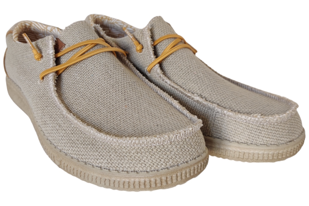 Deze veterschoen heeft een elastische veter. Matriaal stof. Voering stof.Kleur beige. Zool rubber ca 3 cm.