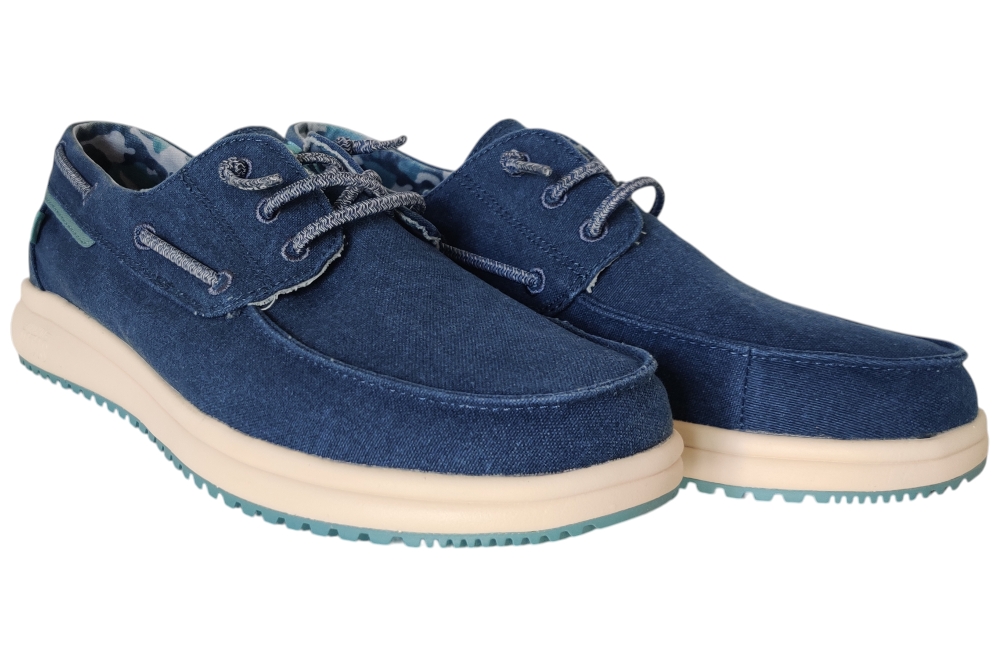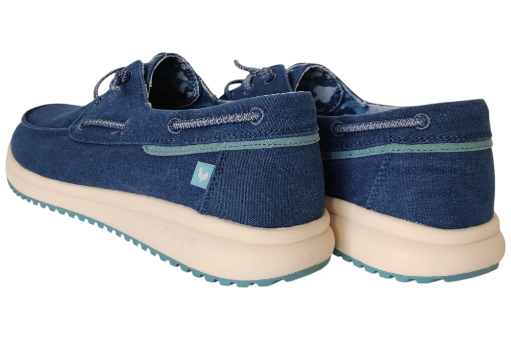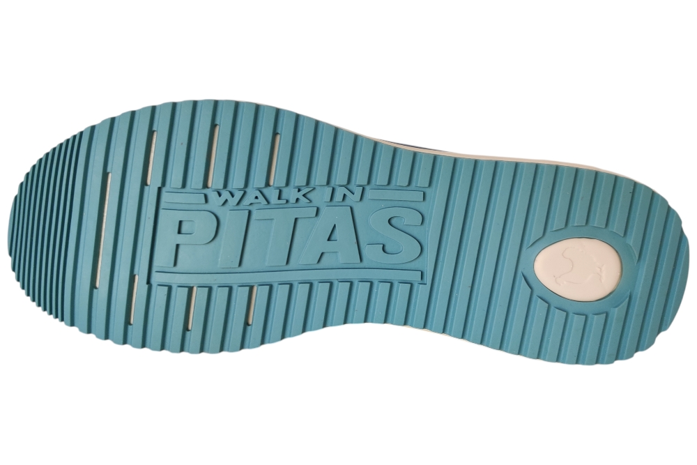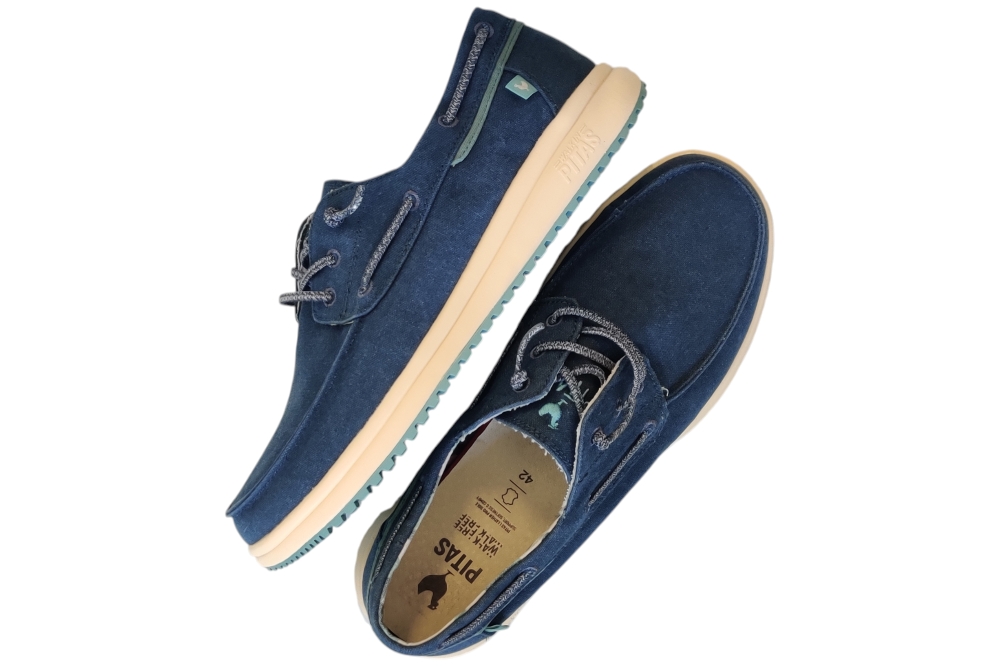 Veterschoen van Pitas.Zeer lichte hippe zomerschoen type bootschoen met los voetbed. Deze veterschoen heeft een elastische veter. Matriaal stof. Voering stof.Kleur blauw. Zool rubber ca 3 cm.