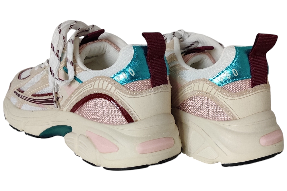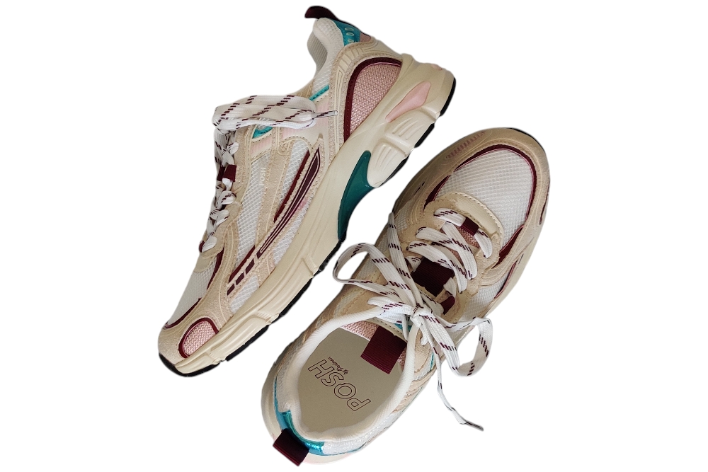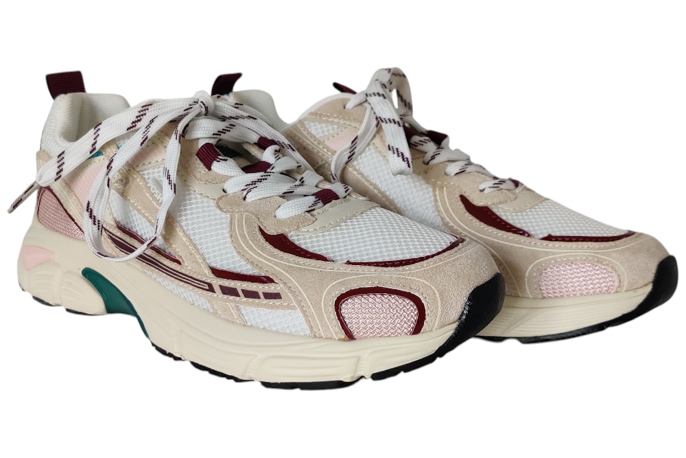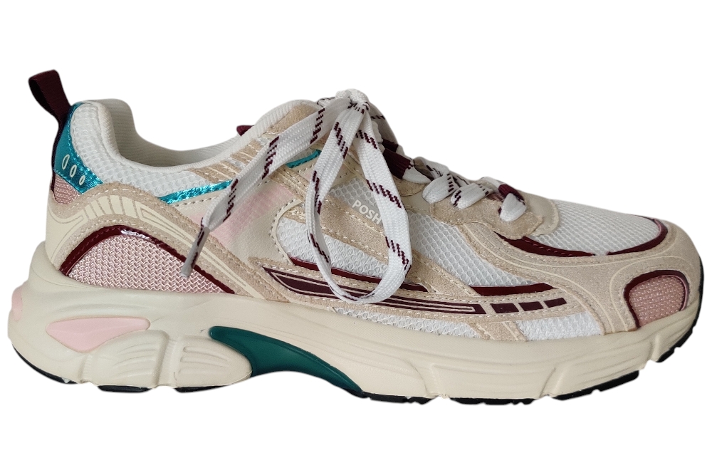 Dames sneaker van Posh. Sneaker in verschillende materialen met uitneembaar voetbed. Materiaal: stof combi. Voering: stof. Kleur: beige bordeaux. Zool: rubber. Hakhoogte: ca 3 cm.