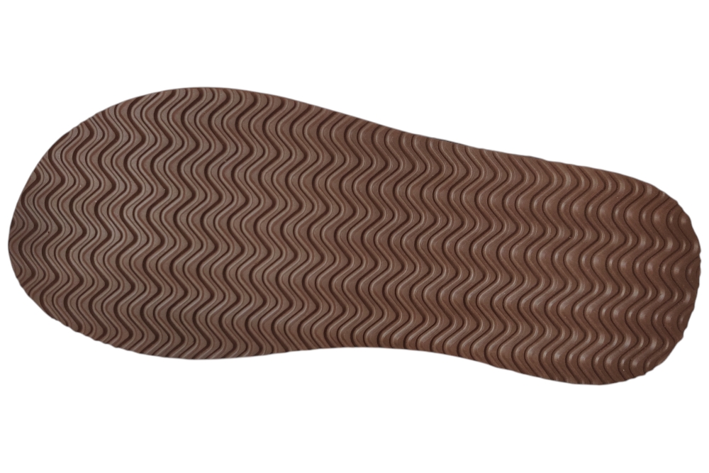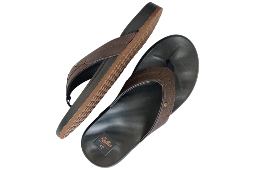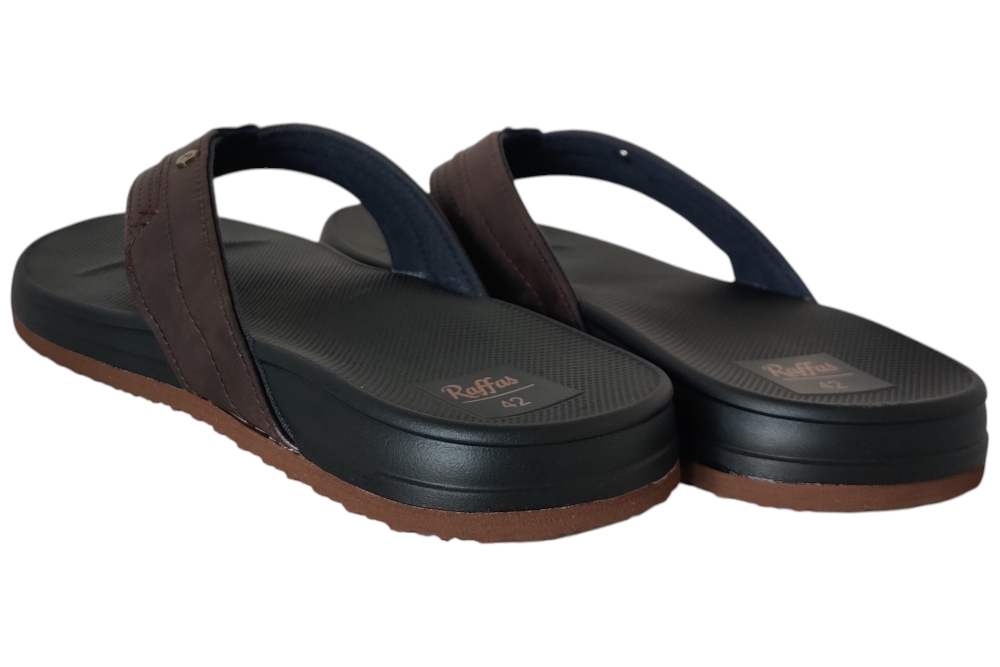 Teenslipper van Raffas. Teenslipper met heel zacht comfortabel voetbed.Matriaal Pu.Kleur Bruin Zool rubber ca 2 cm.
