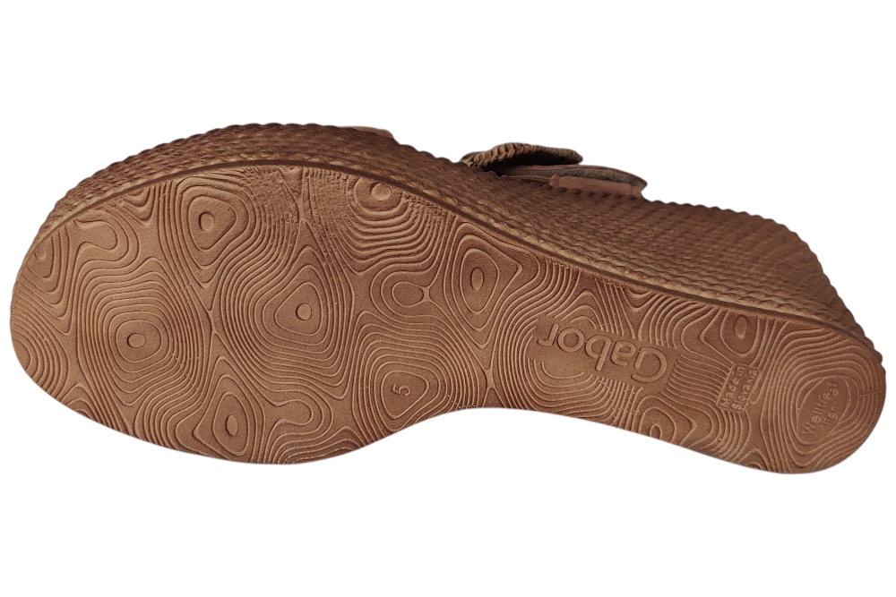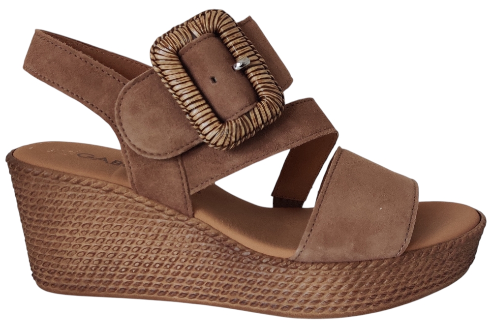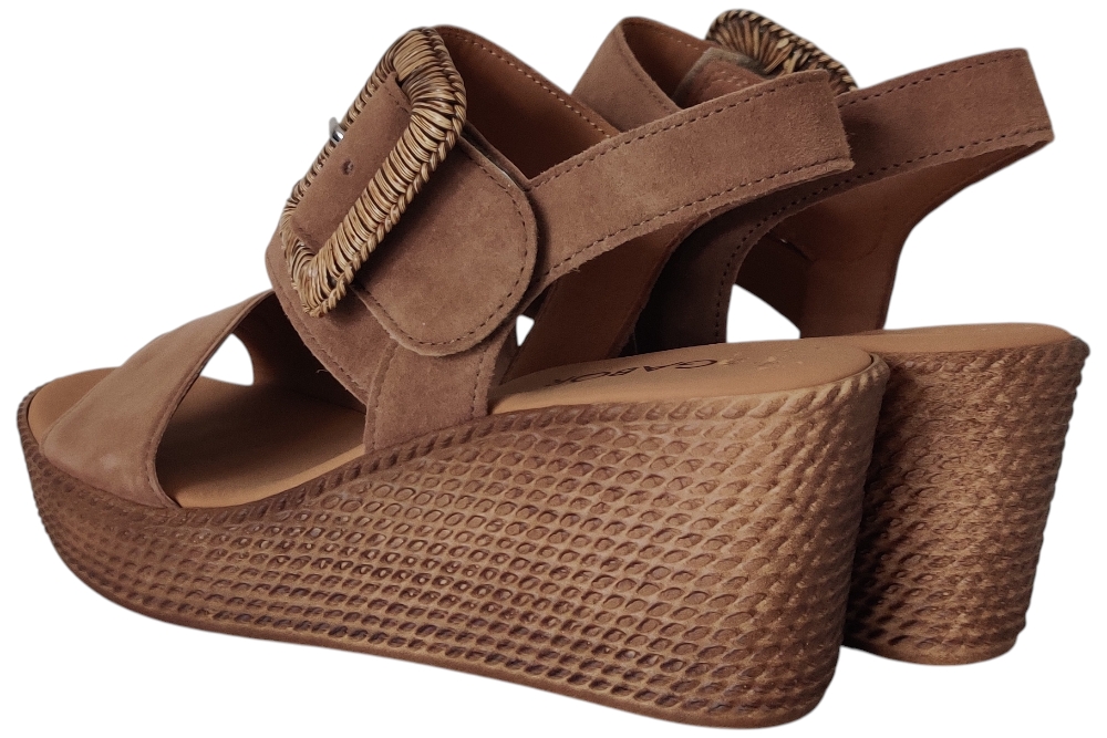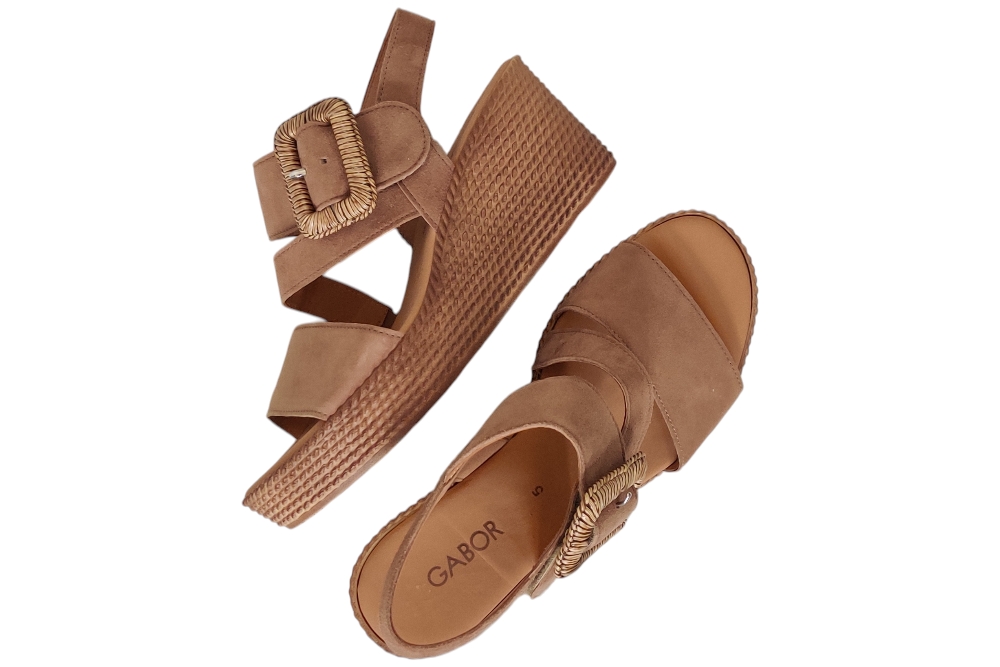 Dames sandaal van Gabor. Sandaal met verstelbare wreefband, op een plateau zool. Materiaal: Suede. Voering: leer. Kleur: Bruin. Zool: rubber. Hakhoogte: ca 4 cm.
