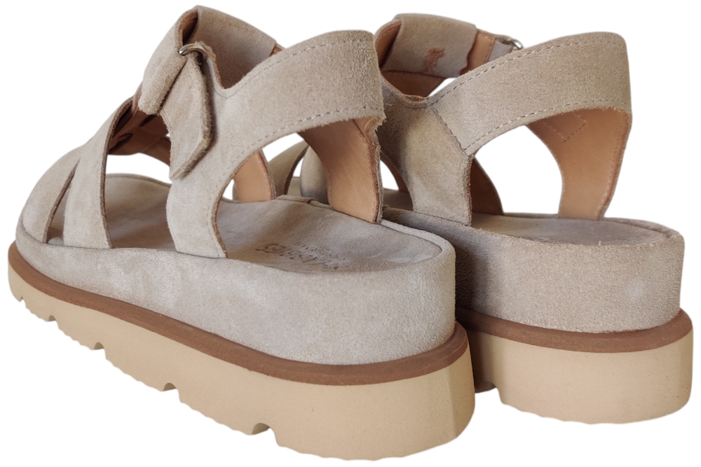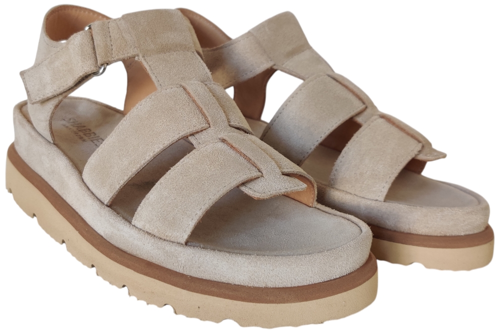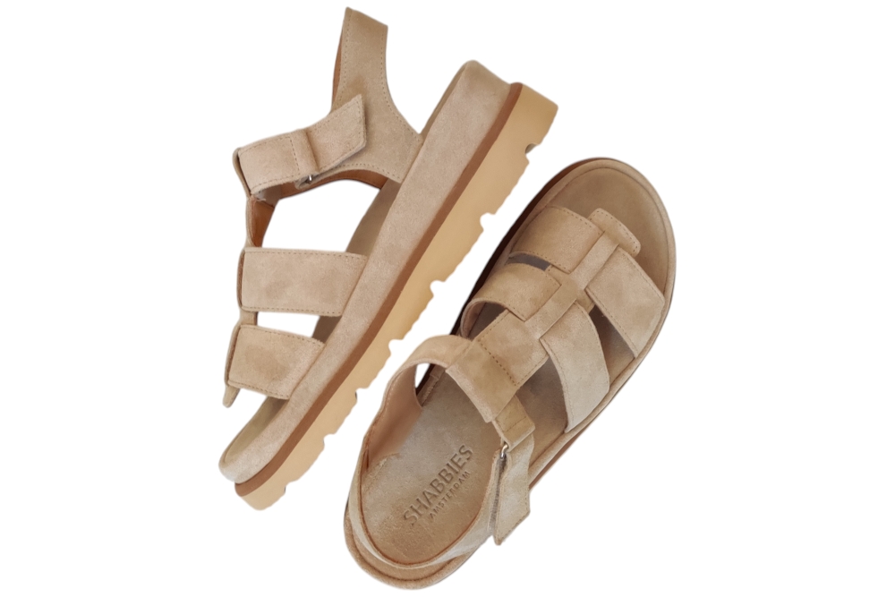 Sandaal van Shabbies. Deze sandaal heeft veel demping in de zool en is van soepel leer. deze sandaal heeft een klitteband sluiting. Kleur beige. Matriaal suede. Voering leer suede. Zool ca 4 cm