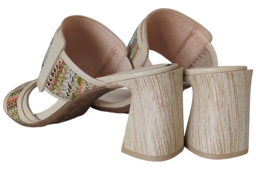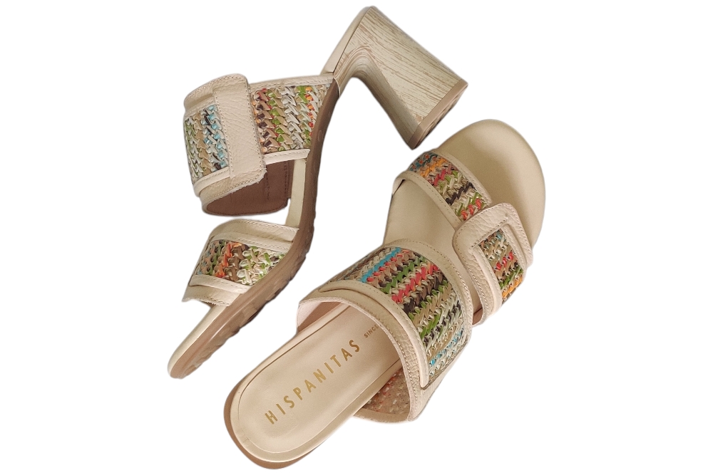 Dames slipper van Hispanitas. Slipper met twee banden raffiavlecht. Materiaal: leer. Voering: leer. Kleur: beige multi color. Zool: antislip. Hakhoogte: ca 5 cm.