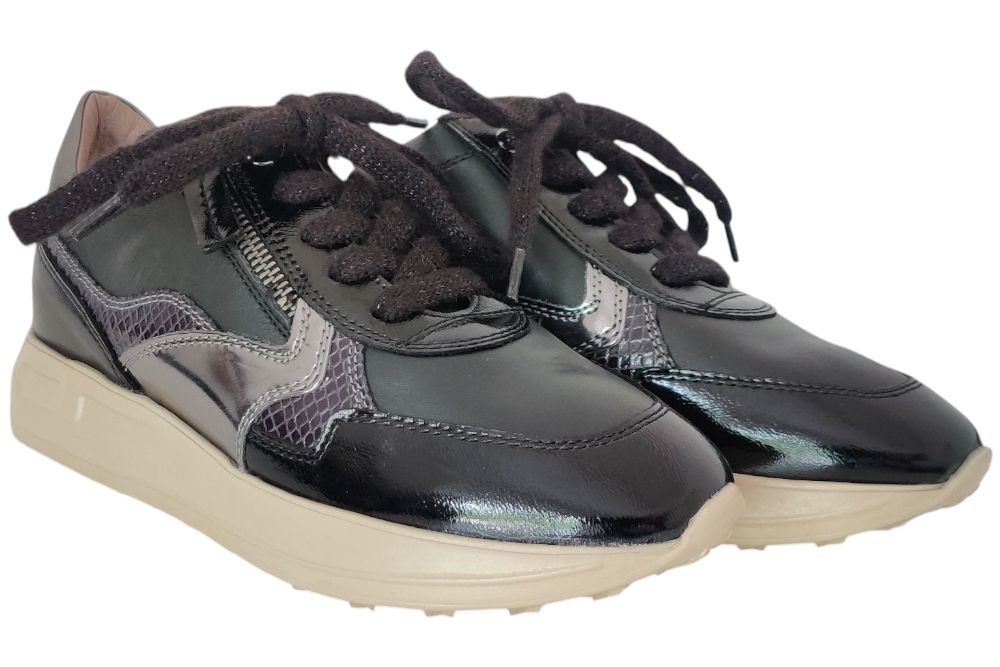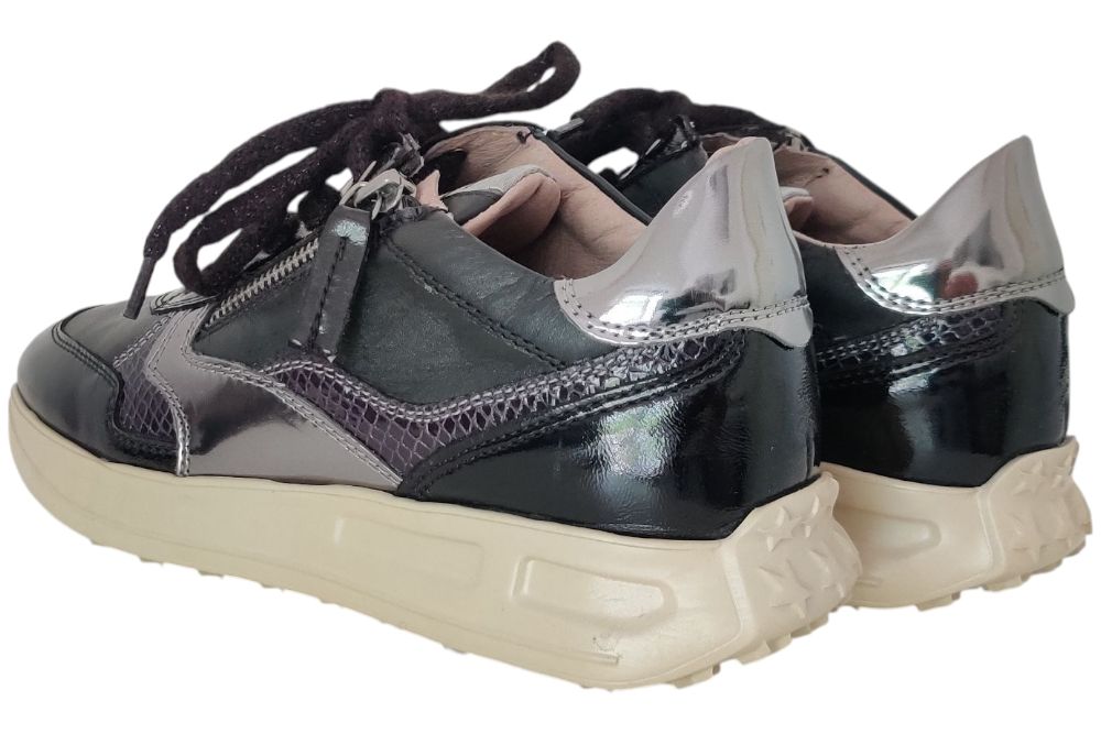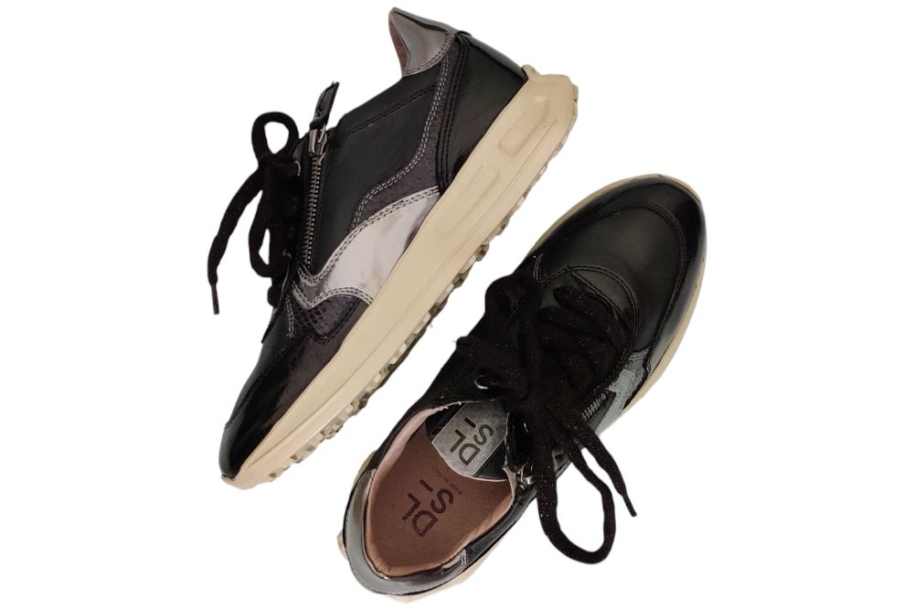 Dames sneaker van DL Sport. Sneaker in verschillende materialen. Deze sneaker heeft een rits en een uitneembaar voetbed. Materiaal: leer combi. Voering: leer. Kleur: zwart combi. Zool: rubber. Hakhoogte: ca 3 cm.