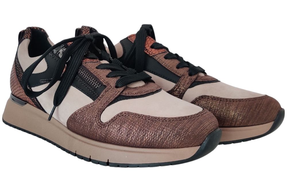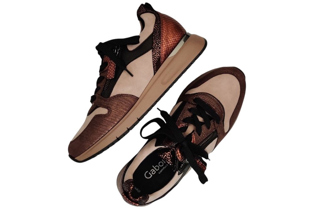 Dames sneaker van Gabor. Sneaker met uitneembaar voetbed.Rits sluiting. Materiaal: suede leer combi Voering: leer .. Kleur: brons beige combi. Zool: rubber. Hakhoogte: ca 3 cm.