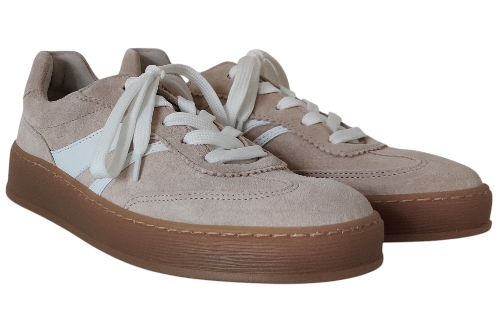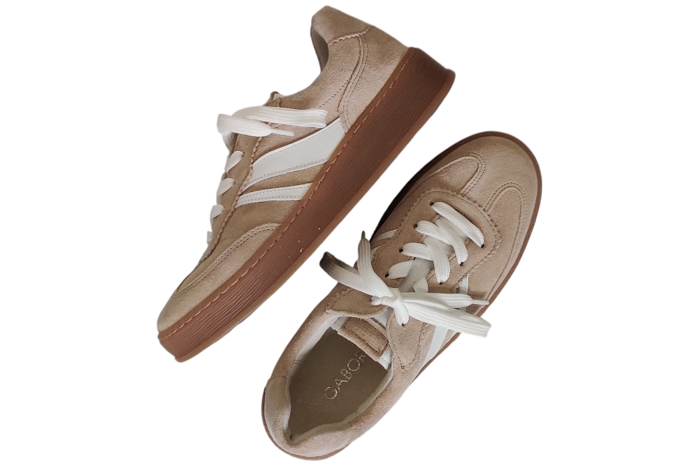 Dames sneaker van Gabor. Hippe sneaker met leuke details. Materiaal: Suede combi. Voering: leer stof.Losse binnenzool, Kleur: Beige. Zool: rubber. Hakhoogte: ca 3 cm.