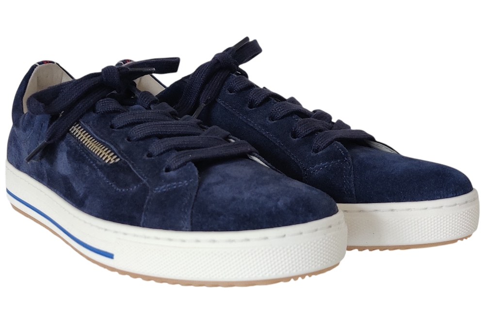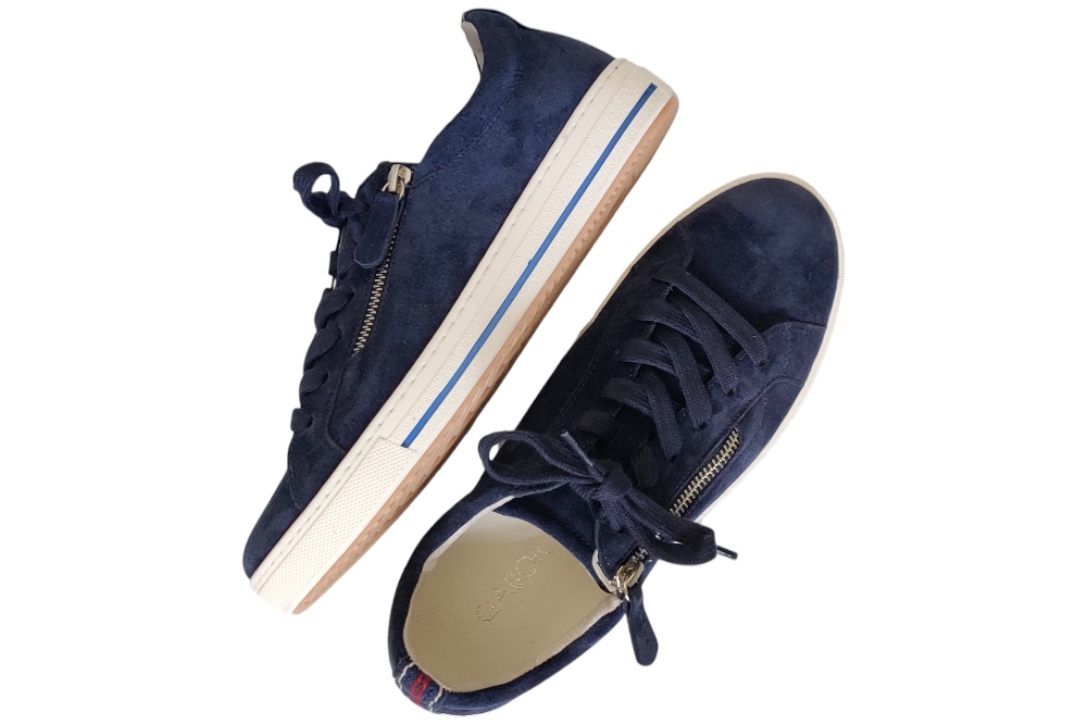 Dames sneaker van Gabor. Hippe sneaker met leuke details. Materiaal: Suede combi. Voering: leer stof.Losse binnenzool, Kleur: Blauw. Zool: rubber. Hakhoogte: ca 3 cm.