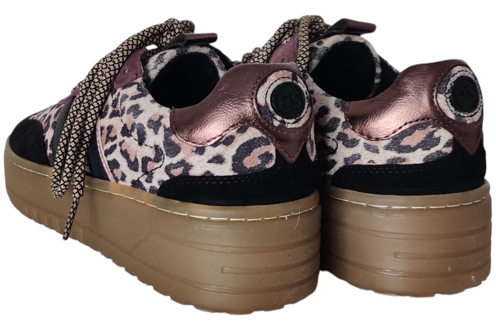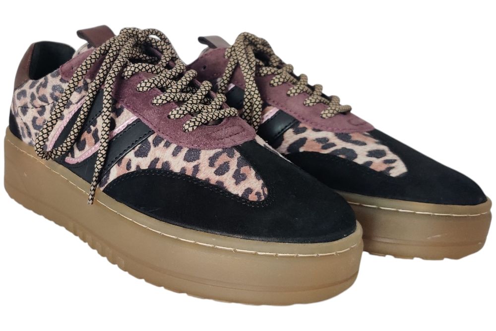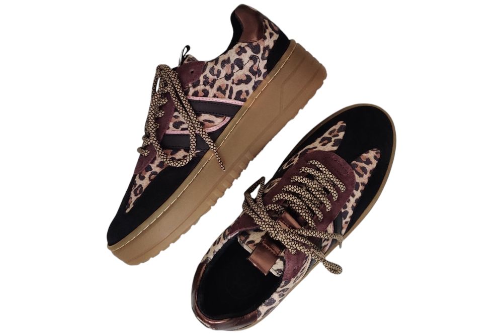 Dames sneaker van Poelman. Sportieve sneaker in een combinatie van verschillende materialen en kleuren. Materiaal: suede combi. Voering: leer textiel. Losse binnenzool.Kleur: panter zwart bruin combi. Zool: rubber. Hakhoogte: ca 3 cm.