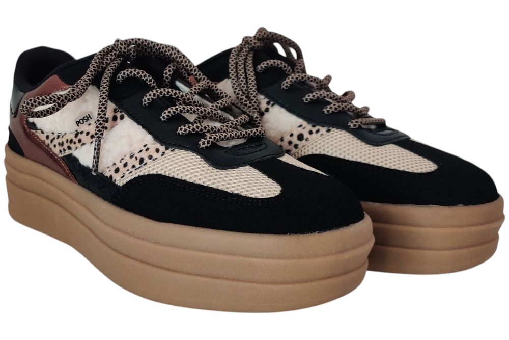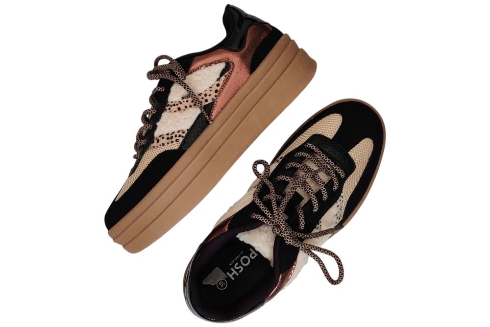 Dames sneaker van Poelman. Sportieve sneaker in verschillende materialen in de kleur zwart en beige accenten. Materiaal: suede combi. Voering: textiel. Kleur:zwart met beige. Zool: rubber. Hakhoogte: ca 4 cm.