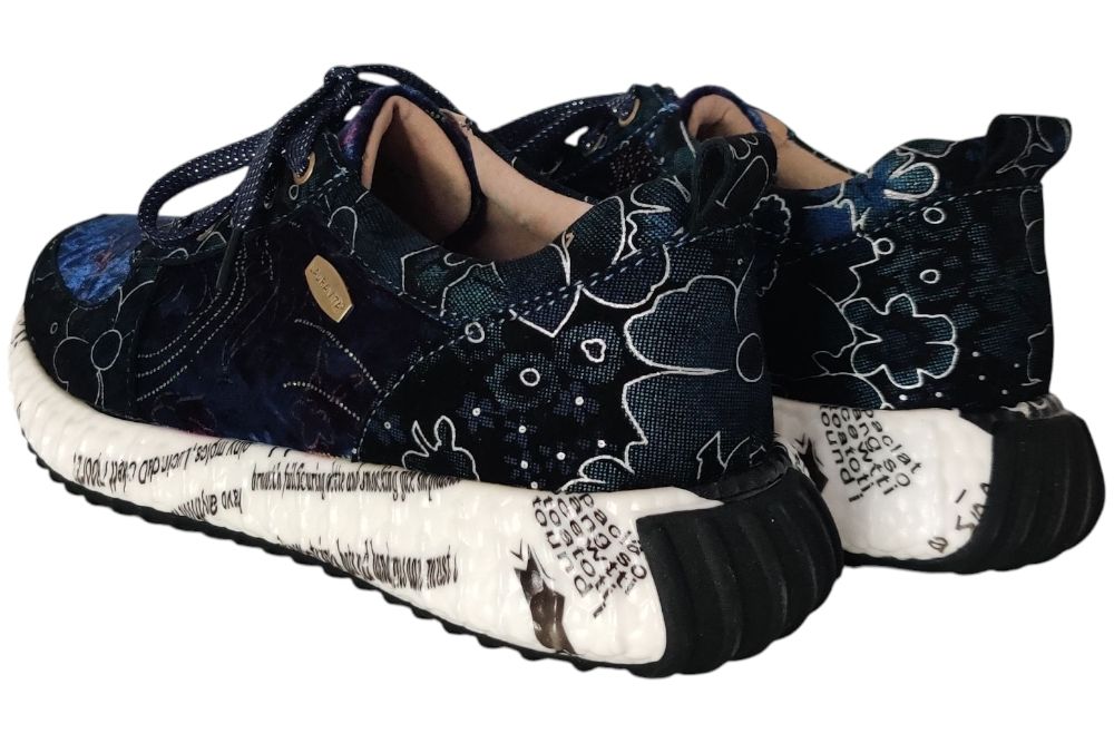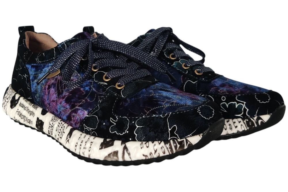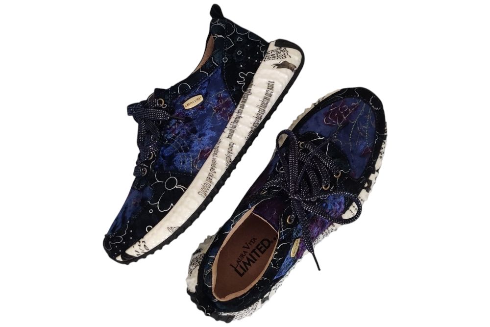 Dames sneaker van Laura Vita. Sneaker in verschillende materialen met uitneembaar voetbed. Materiaal: Leer combi. Voering: deels leer. deels textiel. Kleur: multi color blauw. Zool: rubber. Hakhoogte: ca 4 cm.