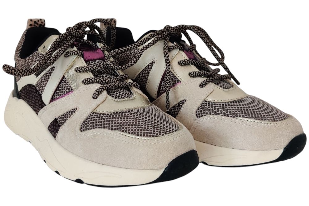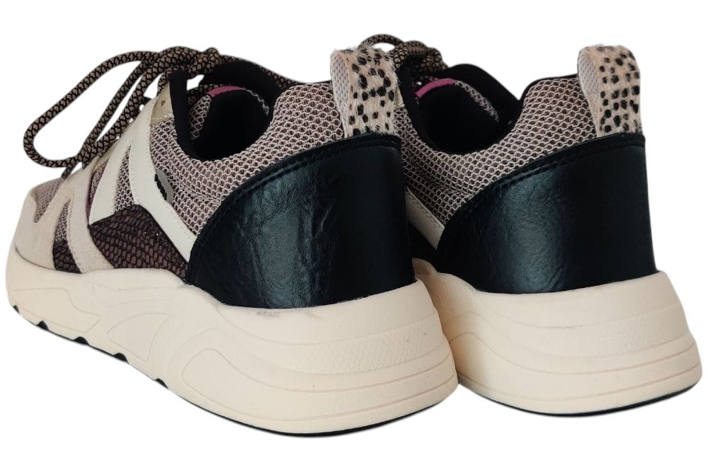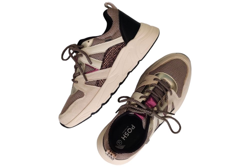 Dames sneaker van Poelman. Sneaker in een combinatie van verschillende materialen. Materiaal: vegan combi. Voering: textiel.Losse binnenzool Kleur: zwart beige. Zool: rubber. Hakhoogte: ca 3 cm.