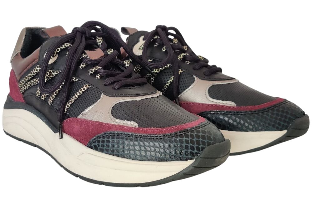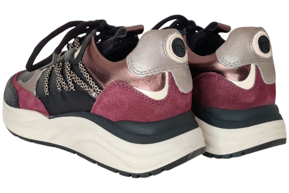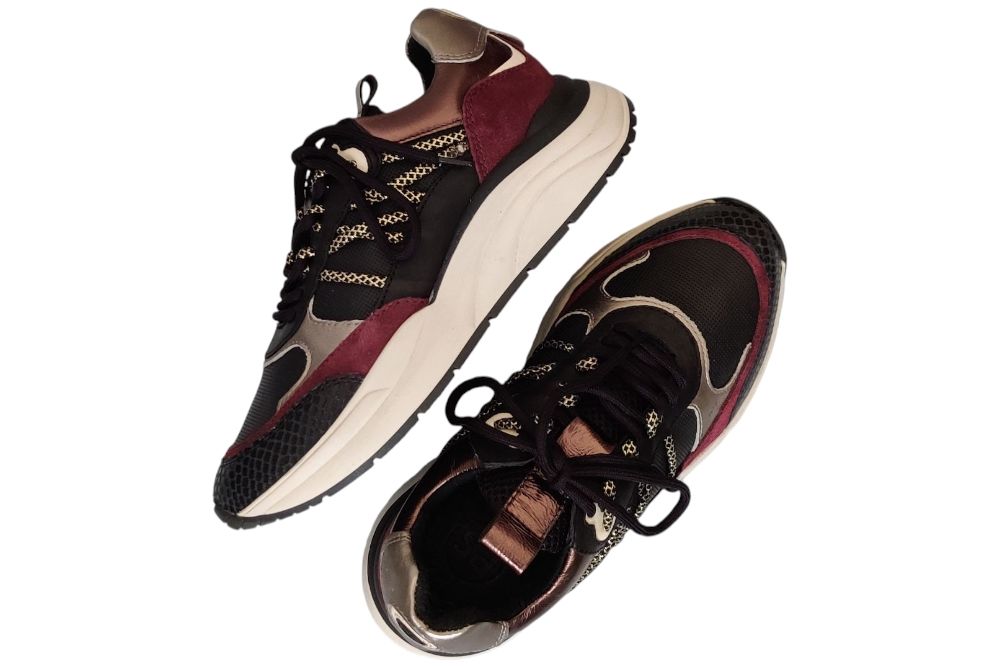 Dames sneaker van Poelman. Sportieve sneaker in verschillende materialen in de kleur zwart en bordo accenten. Materiaal: leer combi. Voering: textiel leer. Kleur:zwart met bordo. Zool: rubber. Hakhoogte: ca 3 cm.