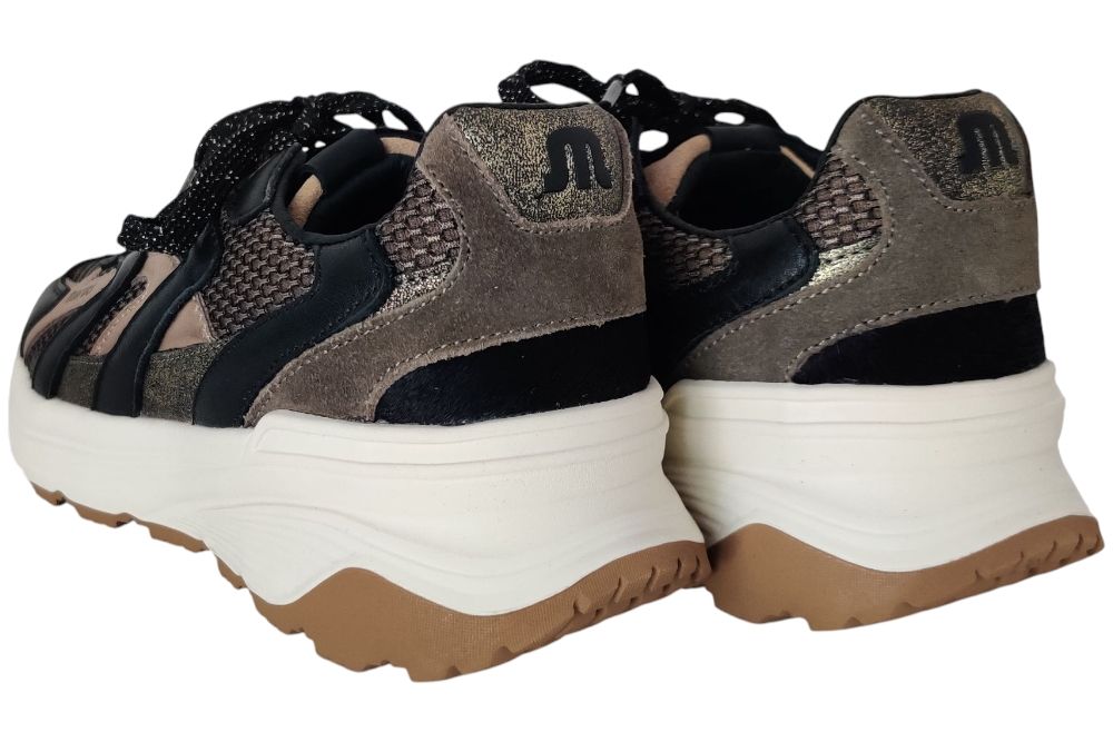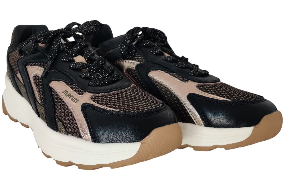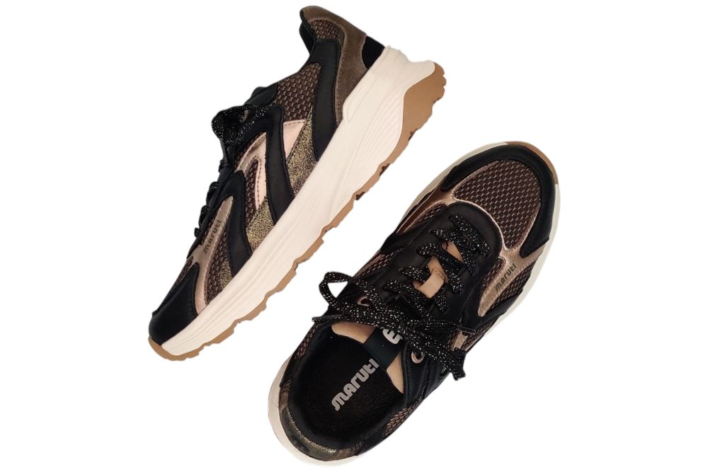 Dames sneaker van Maruti. Basic sneaker in leer combi. Deze sneaker heeft een uitneembaar voetbed. Materiaal: leer. Voering: leer stof. Kleur: Zwart/goud. Zool: rubber. Hakhoogte: ca 3 cm.