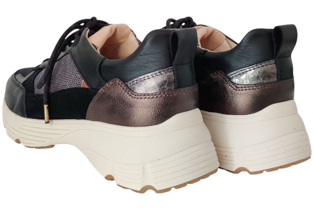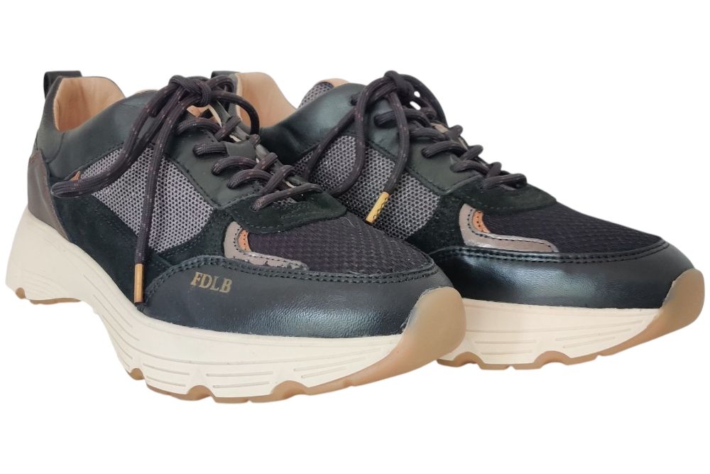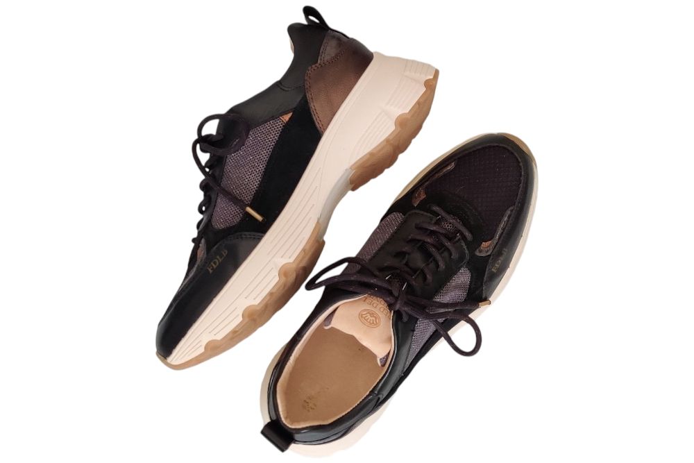 Dames sneaker van Fred de la Bretoniere. Sneaker in verschillende materialen in zwart metbronskleurige details op sportieve zool. Deze sneaker heeft een uitneembaar voetbed. Materiaal: leer combi. Voering:leer. Kleur: zwart. Zool: rubber. Hakhoogte: ca 4