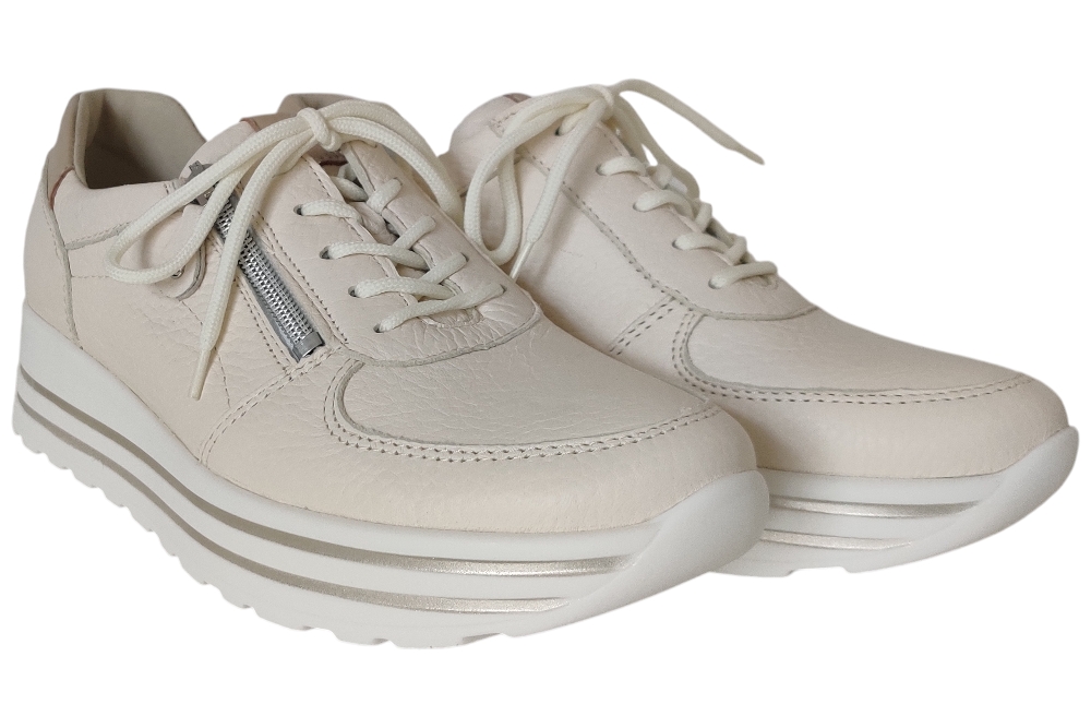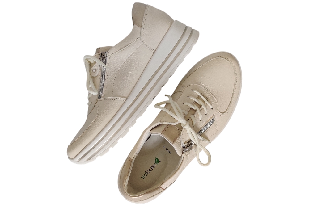 Dames sneaker van Waldlaufer. Basic in glad leer. Deze sneaker heeft een uitneembaar voetbed. Materiaal: leer . Voering: leer. Kleur: beige. Zool: rubber. Hakhoogte: ca 3 cm.